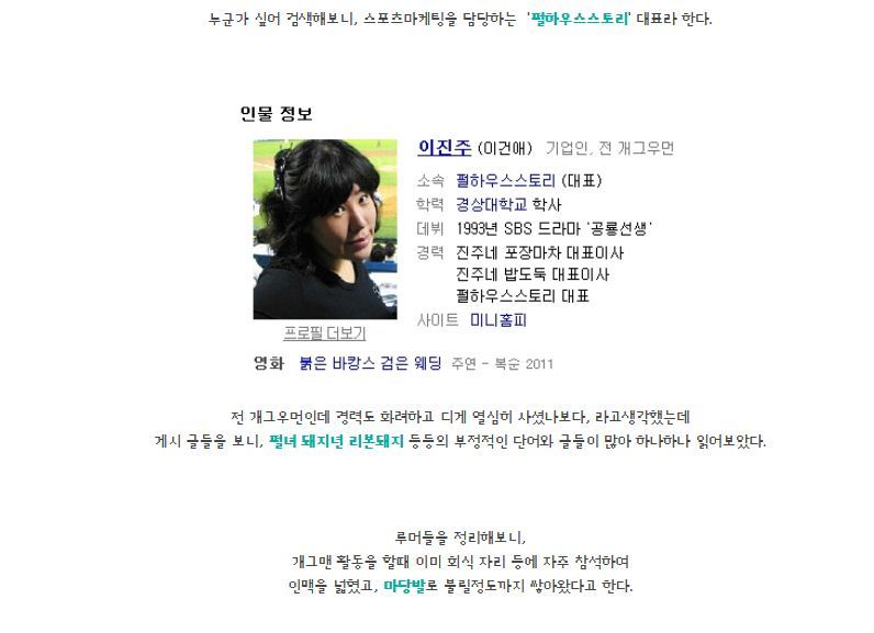 [BGM]류현진 고기셔틀 '펄녀 이진주' 작성자코딱지비빔밥|작성시간12.08.18|조회수9,330 목록 댓글 10 글자크기 작게가 글자크기 크게가 어사카페 http://cafe.daum.net/---999 긴장감.swf 어떤 글에서 펄녀 이진주라는 말 듣고 찾아 봄 못된년인듯 첨부파일첨부된 파일이 18개 있습니다. jpg 파일 a8.jpg jpg 파일 a9.jpg jpg 파일 a10.jpg jpg 파일 a11.jpg jpg 파일 a12.jpg jpg 파일 a13.jpg jpg 파일 a14.jpg jpg 파일 a15.jpg jpg 파일 a16.jpg jpg 파일 a17.jpg jpg 파일 a18.jpg jpg 파일 a19.jpg jpg 파일 a20.jpg jpg 파일 a21.jpg jpg 파일 a22.jpg jpg 파일 a23.jpg jpg 파일 a24.jpg swf 파일 긴장감.swf 다음검색 현재 게시글 추가 기능 열기 북마크 공유하기 신고 센터로 신고 댓글 댓글 10 댓글쓰기 답글쓰기 댓글 리스트 작성자기성용 | 작성시간 12.08.19 얘진짜유명함ㅋㅋㅋㅋㅋㅋㅋㅋㅋㅋㅋㅋㅋㅋㅋㅋㅋㅋㅋ어휴..ㅡㅡ 답댓글 작성자기성용 | 작성시간 12.08.19 기성용이랑 포카리스웨트랑 이어준사람이 얘라는 소문도 있음...ㅋㅎ 작성자쀼앙쀼앙 | 작성시간 13.06.05 뭐지...너무 길어서 읽기가 힘들어ㅠㅠ 작성자도비는자유로운집요정이에요 | 작성시간 13.06.08 모배좀...ㅠㅠ 작성자illionaire records | 작성시간 14.06.02 뭐임...ㅋㅋㅋㅋㅋㅋㅋㅋㅋ 댓글 전체보기
