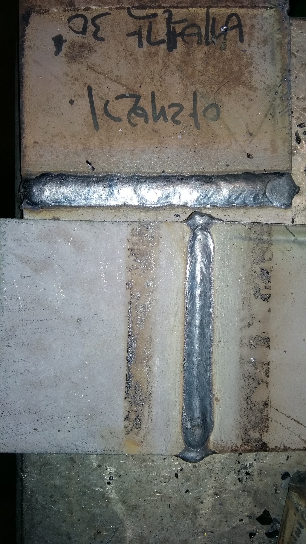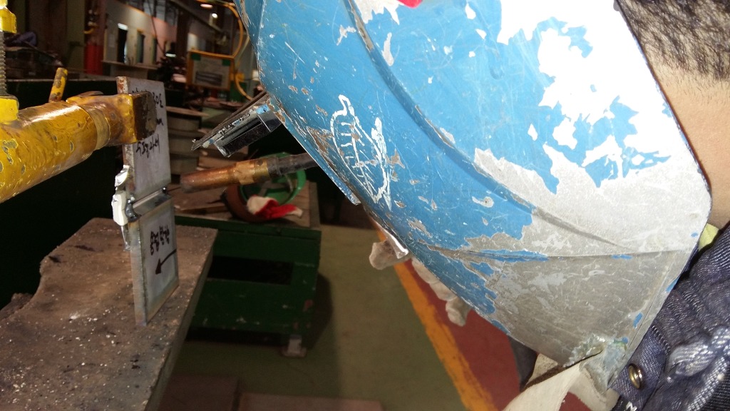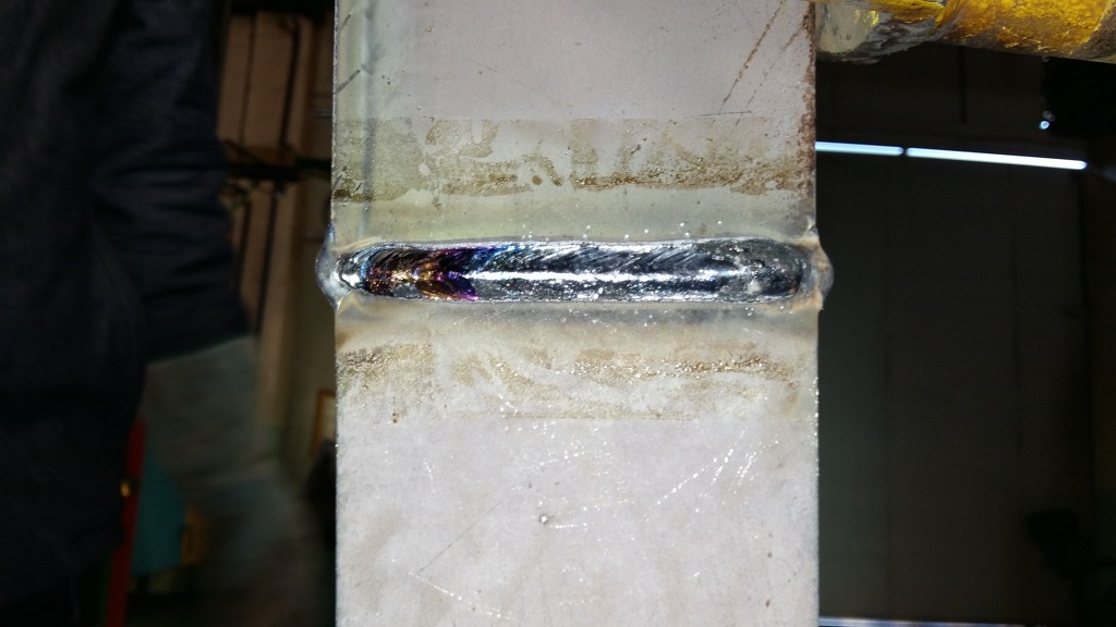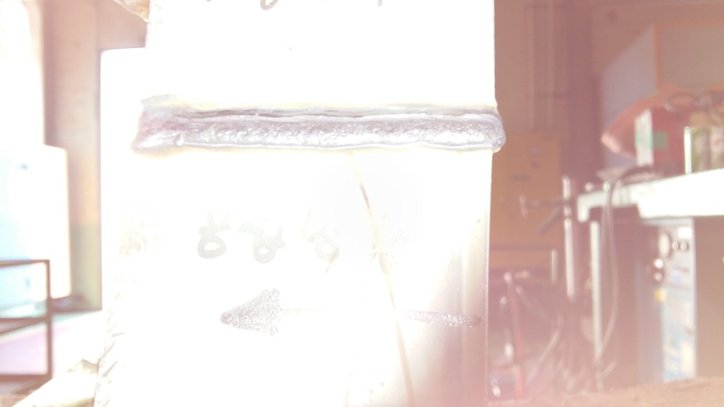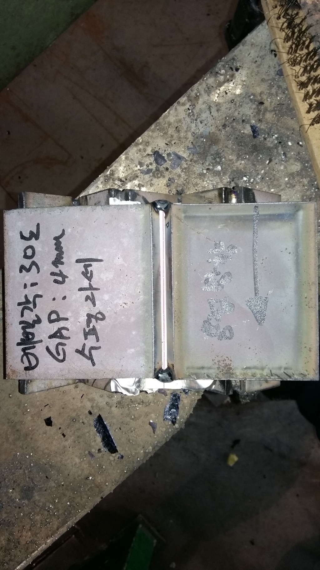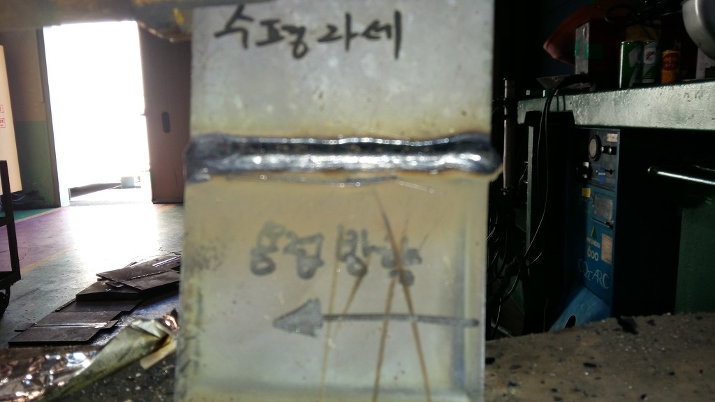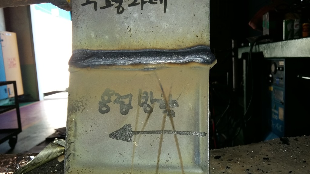 1패스 용접으로 아래쪽 모재의 페이스면은 2mm 정도가 남았고