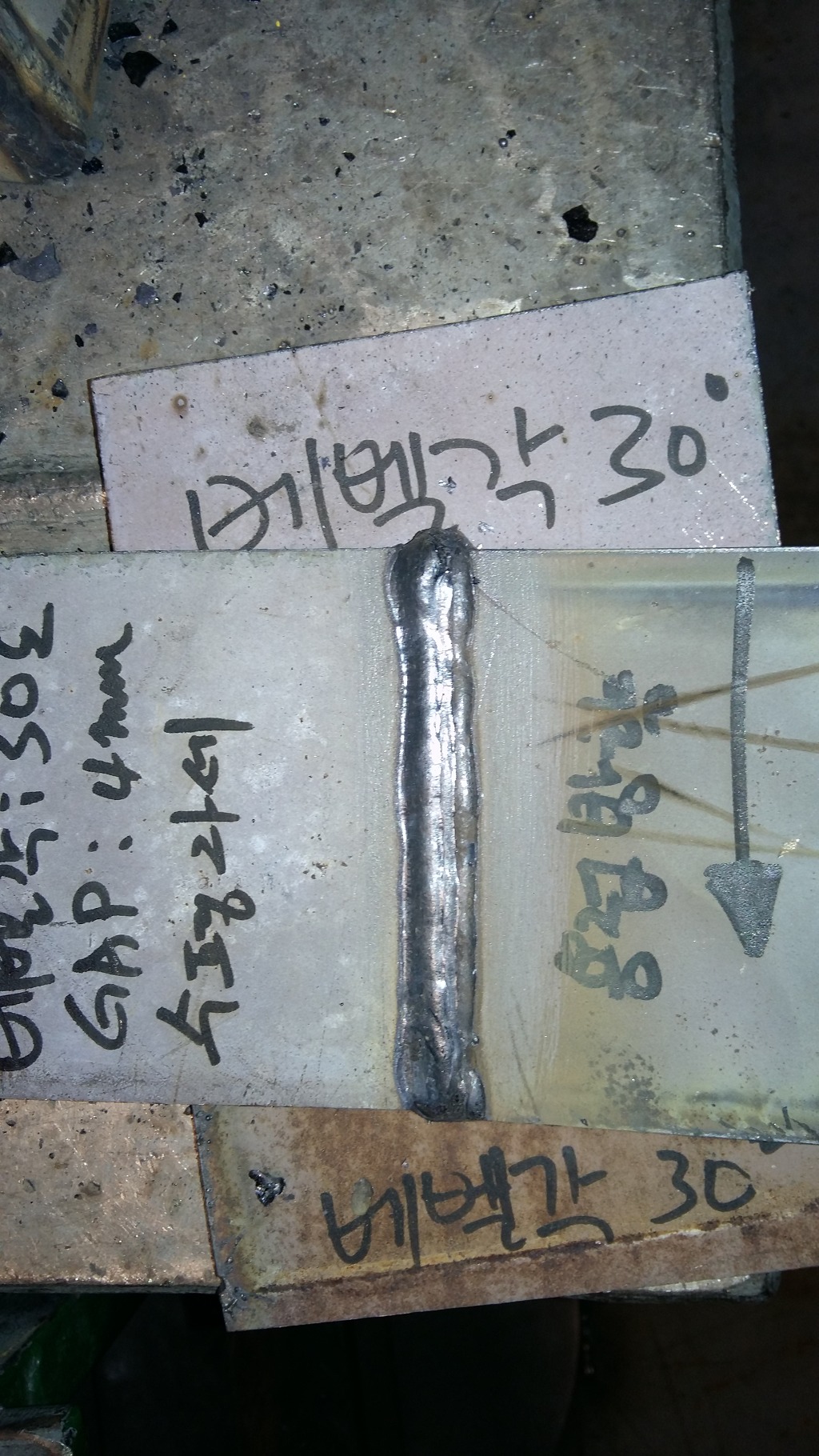 잘 나온다. 시험편을 2장을 맞대기해서 한장은 아래면으로 페이스면이 30도 기울어 있고 한장은 윗방향으로 30도 기울어져 있다.