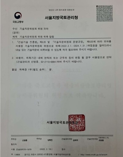 서울지방국토관리청 / 항만공사/ 경상북도-자문위원 위촉 작성자황효섭|작성시간22.02.26|조회수530 목록 댓글 11 글자크기 작게가 글자크기 크게가 카페지기 (네이버 밴드장)- 서울지방국토관리청 자문위원- 평택항만공사 자문위원- 경상북도 공법심의 위원 기술자문위원으로 위촉되었음을 공지합니다 다음검색 현재 게시글 추가 기능 열기 북마크 공유하기 신고 센터로 신고 댓글 댓글 11 댓글쓰기 답글쓰기 댓글 리스트 작성자seokho | 작성시간 22.04.27 축하드립니다~ 작성자소윤호 | 작성시간 22.05.13 축하드림니다 작성자산이좋아 | 작성시간 22.05.19 축하드립니다 작성자리베로 | 작성시간 22.07.06 자문위원 위촉을 진심으로 축하합니다. 작성자김짱 | 작성시간 22.07.08 건승하시고 축하드립니다. 댓글 전체보기