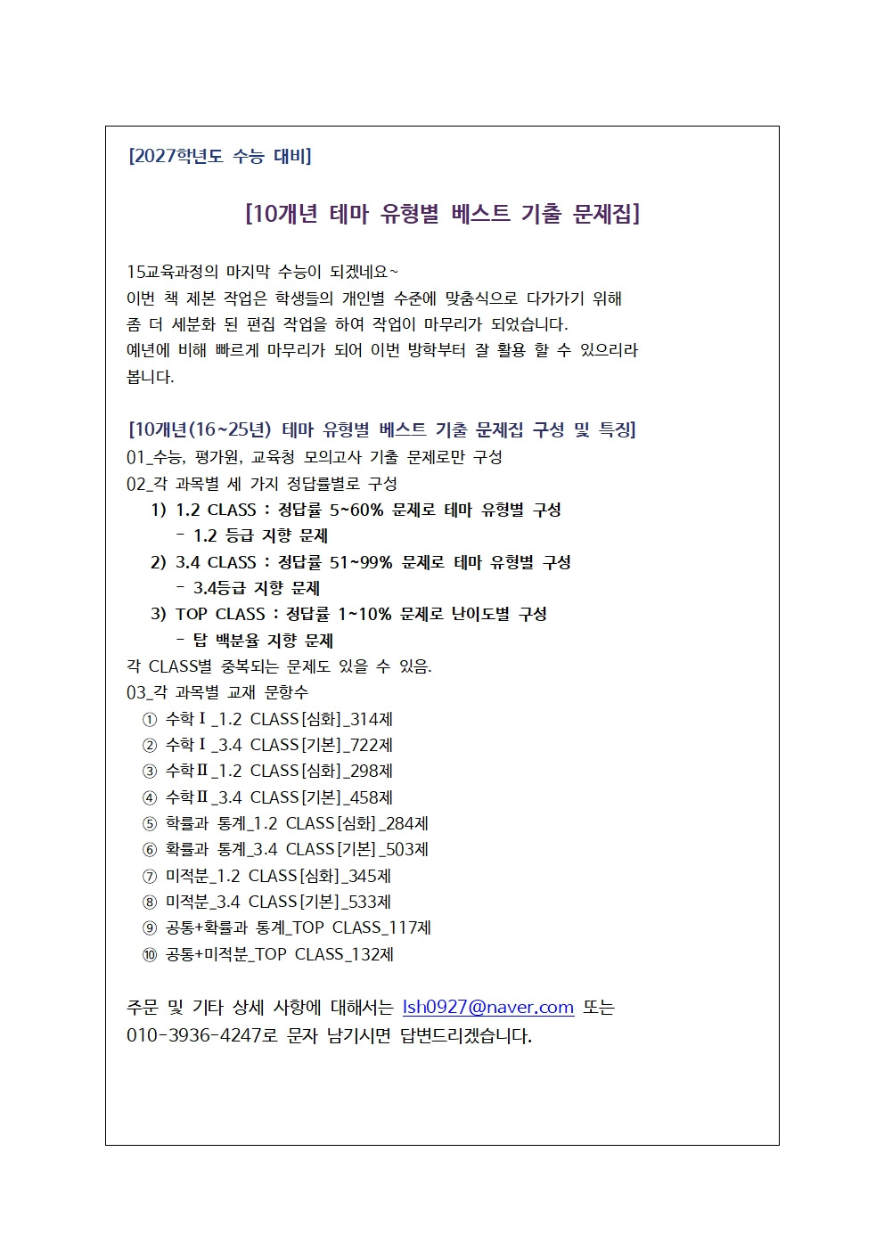 27학년도 수능대비 테마 유형별 10개년 베스트기출문제집 작성자한량|작성시간25.11.26|조회수669 목록 댓글 0 글자크기 작게가 글자크기 크게가 다음검색 현재 게시글 추가 기능 열기 북마크 공유하기 신고 센터로 신고 댓글 댓글 0 댓글쓰기 답글쓰기 댓글 리스트
