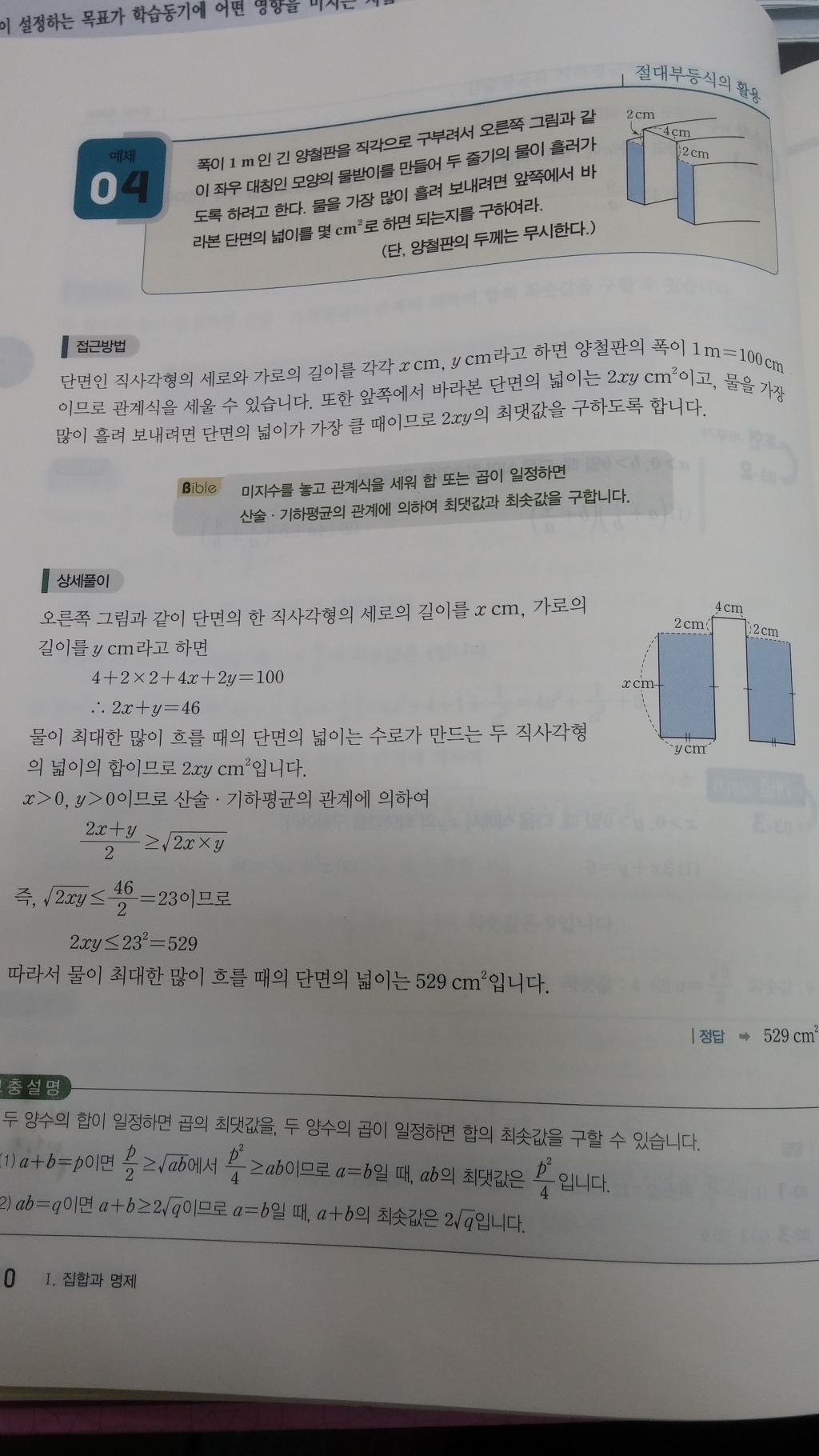 그러면 풀이와 같이 전체 폭이 100cm라는 식을 세우면 2x+y=46이 나오고 물이 채워질 부분의 단면적이 2xy이므로 2xy의 최댓값을 구하는 문제입니다. 등호성립조건에서 2xy가 최대가 되는 경우는 2x=y일 때이므로 2x=y=23 입니다.