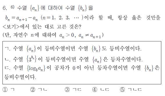 ㄴ. 수열 {3^bn}이 등비수열이면 수열 {bn}은 등차수열, {bn}이 등차수열이라 해서 수열 {an}이 등차수열이란 보장은 없음. 반례로 bn=2n+1, an=n^2 ---> 거짓