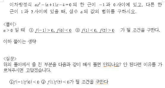 작성자보이는것이전부는아냐 작성시간 14.01.18 다만, 고1에게 문제를 몇 백 문제 더 풀거나 문제 유형을 몇 십 개 더 익히는 것보다 훨씬 더 중요한 것들 중에 하나는, 전체 경우를 적절하게 분할하는 방법을 익히는 것이라고 생각해요. 이 문제를 읽고 우선 a>0, a<0 으로 나누면서 "2차방정식이라고 했으니 a≠0 일 것"이라는 생각을 하고, 분할된 각각의 경우에 대해 결과를 얻어내고 그것들을 다시 종합하는 과정은 저학년 때 반드시 겪어야 한다고 생각해요. 진월거사님은 연륜이 높은 선생님이시니 좋은 방법을 선택하시리라고 생각해요.^^