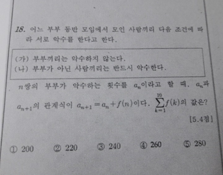 [고3]수열 귀납법 기출문제 질문입니다ㅜ 작성자김냥이|작성시간18.04.24|조회수735 목록 댓글 2 글자크기 작게가 글자크기 크게가 풀이 부탁드려요!ㅜㅜ 다음검색 현재 게시글 추가 기능 열기 북마크 공유하기 신고 센터로 신고 댓글 댓글 2 댓글쓰기 답글쓰기 댓글 리스트 작성자성지훈 | 작성시간 18.04.24 n쌍의 부부가 악수하는 횟수=a_n여기에 1쌍의 부부가 추가되면 늘어나게 되는 악수횟수는 이 부부가 각각 하게 되는 악수 횟수의 합과 동일합니다.남편과 아내는 각각 기존 n쌍의 모든 사람과 악수를 해야하므로 2n회씩 악수를 해야합니다.따라서 f(n)=4n.따라서 준식=4*(1~10합)=220. 답댓글 작성자김냥이 작성자 본인 여부 작성자 | 작성시간 18.04.24 정말 감사합니다! 댓글 전체보기