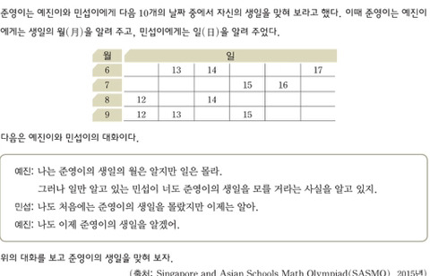 답댓글 작성자온빛 작성시간 18.10.06 민섭이는 본인이 들은 날짜를 통해 생일을 알아냈을 것이고, 예진이 입장에서 8/14, 9/13, 9/15 중 하나가 생일이라고 추론할 수 있습니다. 그 상황에서 예진이 역시 생일을 알겠다고 한 것을 통해 준영이의 생일이 8/14 임을 알 수 있습니다. 만약 예진이가 9월이라고 준영이에게 들었다면, 여전히 9/13, 9/15 중에 선택할 수가 없기 때문입니다.