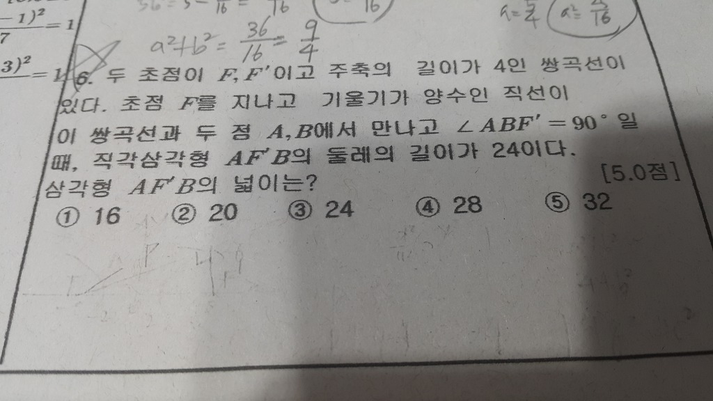 고2기벡 작성자부자 만들기|작성시간19.03.06|조회수157 목록 댓글 2 글자크기 작게가 글자크기 크게가 잘안되네요ㅠㅠ 부탁드립니다 정답은3번입니다 다음검색 현재 게시글 추가 기능 열기 북마크 공유하기 신고 센터로 신고 댓글 댓글 2 댓글쓰기 답글쓰기 댓글 리스트 작성자yesrainy | 작성시간 19.03.07 쌍곡선 정의에의해 AF'=a, AF=a-4, BF=b-4, BF'=b라하면 둘레가 24이므로 a+b=16..피타고라스 정리에 의해 a^2=b^2+64..a=10, b=6.. 답댓글 작성자부자 만들기 작성자 본인 여부 작성자 | 작성시간 19.03.07 넘넘 고맙습니다! ! ! 댓글 전체보기