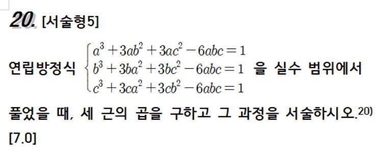 답댓글 작성자수학쟁이_이명래수학원™ 작성시간 16.04.30 Math_Gauss 식구조상 a=b=c가 나올수 밖에 없고 아무식이나 한문자로 표현하면 a^3=1이 나오지 않나요?