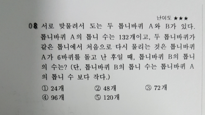 [중학교 수와식]중1...톱니바퀴수 구하기문제에요. 작성자무냐|작성시간19.04.23|조회수1,812 목록 댓글 2 글자크기 작게가 글자크기 크게가 최소공배수활용문제인데요...저는 답이 24와..72 두개가 나오는데요...왜 답이 72인지 모르겠어요. 한번 봐주세요 다음검색 현재 게시글 추가 기능 열기 북마크 공유하기 신고 센터로 신고 댓글 댓글 2 댓글쓰기 답글쓰기 댓글 리스트 작성자단한번인인연 | 작성시간 19.04.23 132 : 2^2×3^2×11이고최소공배수는 2^3×3^2×11이므로B톱니수는 2^3×3^2이어야하므로 72 작성자무냐 작성자 본인 여부 작성자 | 작성시간 19.04.23 ㅎㅎ아....이제 이해됐어여. 고맙습니다 댓글 전체보기