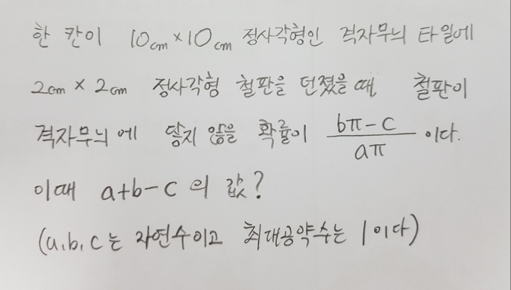 [확률과 통계]뷔퐁 확통 문제풀이 부탁드립니다 작성자초초보수학|작성시간19.04.27|조회수288 목록 댓글 0 글자크기 작게가 글자크기 크게가 1. 제목에 출처와 범위를 써주세요2. 출처:문제지3. 범위:확률4. 나는 이런 방식으로 풀었어요:어떻게 풀어야할지 모르겠어요.ㅠ뷔퐁의 바늘문제 변형이라는것까지는 찾았습니다.해석이 너무 어렵네요. 다음검색 현재 게시글 추가 기능 열기 북마크 공유하기 신고 센터로 신고 댓글 댓글 0 댓글쓰기 답글쓰기 댓글 리스트