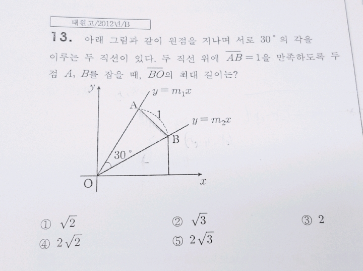 [기하]분당 2012. 태원고 기출 입니다 작성자별나라다방|작성시간19.06.21|조회수144 목록 댓글 2 글자크기 작게가 글자크기 크게가 범위는코사인법칙입니다고수님들 풀이 부탁드립니다ㅠ 다음검색 현재 게시글 추가 기능 열기 북마크 공유하기 신고 센터로 신고 댓글 댓글 2 댓글쓰기 답글쓰기 댓글 리스트 작성자시습지 | 작성시간 19.06.21 1/sin30=OB/sinAOB=sinA/sin30A=90일 때. 최대 2 답댓글 작성자별나라다방 작성자 본인 여부 작성자 | 작성시간 19.06.21 감사드립니다 댓글 전체보기
