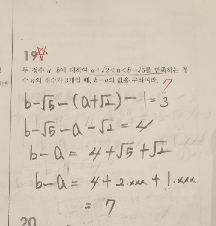 [중학교 수와식]중학교3-1제곱근 (블랙라벨) 작성자leonhardeuler1707|작성시간19.12.28|조회수1,671 목록 댓글 2 글자크기 작게가 글자크기 크게가 학생에게 아래와 같이 풀이 해줘도될까요?답은 7입니다!블랙라벨에 있는 문제입니다. 다음검색 현재 게시글 추가 기능 열기 북마크 공유하기 신고 센터로 신고 댓글 댓글 2 댓글쓰기 답글쓰기 댓글 리스트 작성자eien | 작성시간 19.12.28 정수 조건이므로a+2 <= n <= b-3b-3-(a+2)+1=3b-a=7이렇게 설명하면 될거 같습니다. 답댓글 작성자leonhardeuler1707 작성자 본인 여부 작성자 | 작성시간 19.12.28 아~선생님!고맙습니다 😊 댓글 전체보기