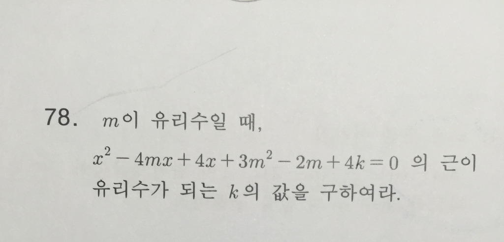 작성자무명훈수꾼 작성시간 16.05.08 개념적으로 근이 유리수라 함은 근의 공식에서 무리수 부분이 0 이 되어야 한다는 이야기입니다. 그래서 위의 식을 풀 때는 판별식이 0 이 되는 조건으로 풀어야 합니다. 위의 식을 정리하면 x^2 -4(m-1)x + 3m^2 -2m+4k=0이 됩니다. x항의 계수가 짝수이므로, D(판별식)/4 = (m-1)^2 - (3m^2- 2m + 4k)=0 이 딥니다. 이를 전개하면 -2m^2 -4k+1 =0 이 됩니다.
