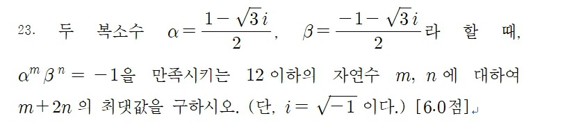 [대수]수학 상 복소수 질문드립니다. 작성자Rocketboy|작성시간20.05.25|조회수156 목록 댓글 2 글자크기 작게가 글자크기 크게가 1. 제목에 출처와 범위를 써주세요2. 출처:3. 범위:4. 나는 이런 방식으로 풀었어요: 다음검색 현재 게시글 추가 기능 열기 북마크 공유하기 신고 센터로 신고 댓글 댓글 2 댓글쓰기 답글쓰기 댓글 리스트 작성자m-teacher | 작성시간 20.05.25 b = a^2 이므로 a^m * b^n = a^(m+2n) = -1 을 만족하면 된다.a^3 = -1 이므로 a^3 = -1, a^9 = -1, a^15 = -1, a^21 = -1, a^27 = -1, a^33 = -112이하 이므로 m+2n은 36 이하.....따라서 m+2n의 최댓값은 33 작성자Rocketboy 작성자 본인 여부 작성자 | 작성시간 20.05.26 감사합니다. ^^ 댓글 전체보기
