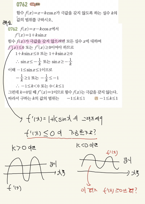 극값을 갖지 않으려면 도함수가 0보다 크거나 작다 이용해서 푸는 문제인데, 위 식에서 도함수가 0보다 작거나 같다 자체가 성립이 안되는거 같은데 어떻게 위 식대로 계산이 가능한건지 궁금합니다