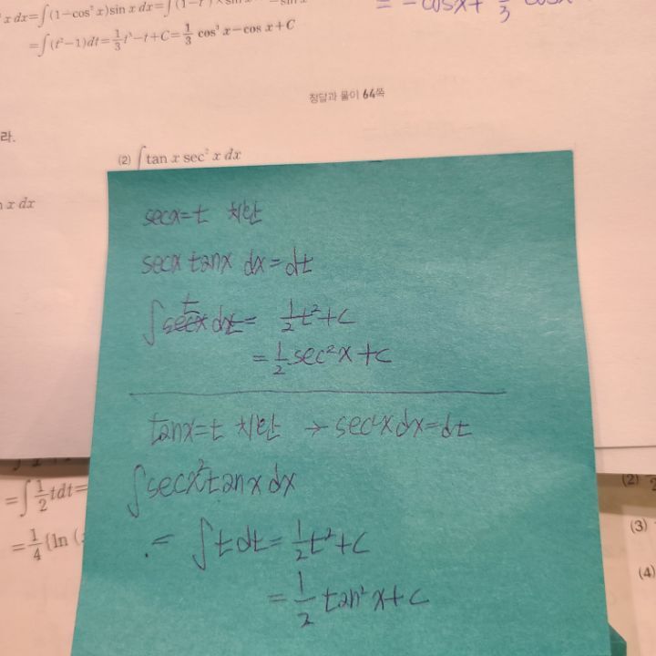 미적분 / 치환적분 질문입니다 작성자어린이|작성시간21.02.07|조회수662 목록 댓글 2 글자크기 작게가 글자크기 크게가 1. 제목에 출처와 범위를 써주세요2. 출처: 풍산자3. 범위: 미적분 / 치환적분4. 나는 이런 방식으로 풀었어요: 뭘 치환하냐에 따라 적분값이 다르게 나오는데 왜 오류가 생겼는지 궁금해 질문합니다 다음검색 현재 게시글 추가 기능 열기 북마크 공유하기 신고 센터로 신고 댓글 댓글 2 댓글쓰기 답글쓰기 댓글 리스트 작성자오대감 | 작성시간 21.02.07 생긴게 다르다고 적분값이 다른게 아닙니다.tan²x + 1 = sec²x1/2 × (tan²x + 1) = 1/2 × sec²x(1/2 × tan²x) + 1/2 = (1/2 × sec²x)두 식의 차이인 1/2을 적분상수가 커버합니다.따라서, 결과값이 다른게 아닙니다. 답댓글 작성자어린이 작성자 본인 여부 작성자 | 작성시간 21.02.07 아 그렇네요! 감사합니다! 댓글 전체보기