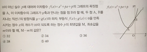 작성자대각국사 작성시간 21.03.22 그림이 조금 이상하지만 p>0 이면 -10< - p/2 <= -9 18<= p <20 p의 최대 19
