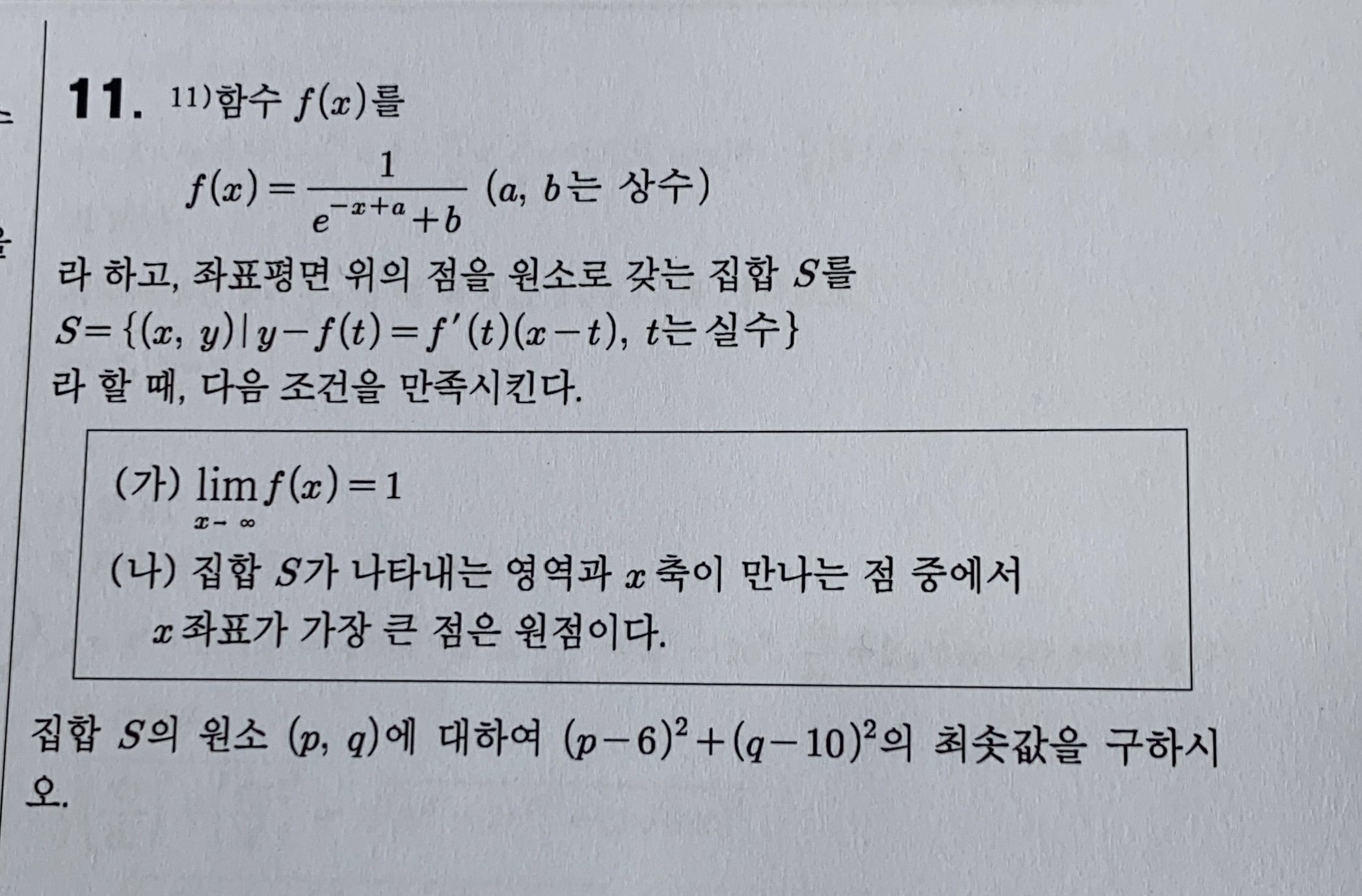 작성자yesrainy 작성시간 21.07.31 조건(가)에서 b=1..조건(나)에서 a=2..f(x) 의 변곡점(2,1/2)에서의 접선이 원점을 지나고 그때 접선y=(1/4)x과 (6,10)에서 거리가 최소..
