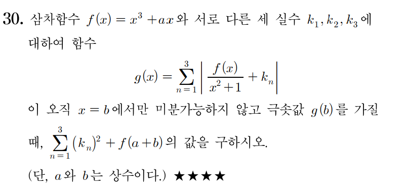 작성자yesrainy 작성시간 21.08.30 검투사 선생님과 다른접근입니다..일단 h(x)=(x^3+ax)/(x^2+1)은 기함수이고 h(0)=0..h'(x)의 분자에서 x^4+(3-a)x^2+a가 나오는데 g(x)가 한점에서만 미분불가능하려면 a=9이어야하고 그때 h(x)그래프 그려보면 k는 쉽게 결정될겁니다..