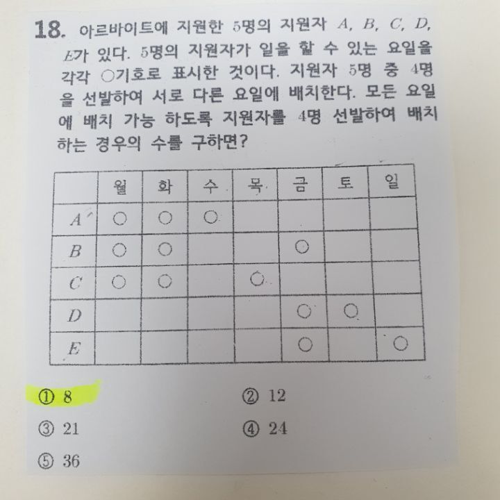 중2경우의수질문입니다 작성자jubilia|작성시간21.09.15|조회수433 목록 댓글 2 글자크기 작게가 글자크기 크게가 1. 제목에 출처와 범위를 써주세요2. 출처:3. 범위:4. 나는 이런 방식으로 풀었어요:2019년 해운대중기출문제입니다 답이 1번이라는데 저는 잘 모르겠습니다 ㅠ 다음검색 현재 게시글 추가 기능 열기 북마크 공유하기 신고 센터로 신고 댓글 댓글 2 댓글쓰기 답글쓰기 댓글 리스트 작성자티쵸 | 작성시간 21.09.15 이미지 확대 작성자오대감 | 작성시간 21.09.15 A, C, D, E 를 뽑아야 함월요일 : A, C수요일 : A, C금요일 : D, E2 × 2 × 2 = 8 댓글 전체보기