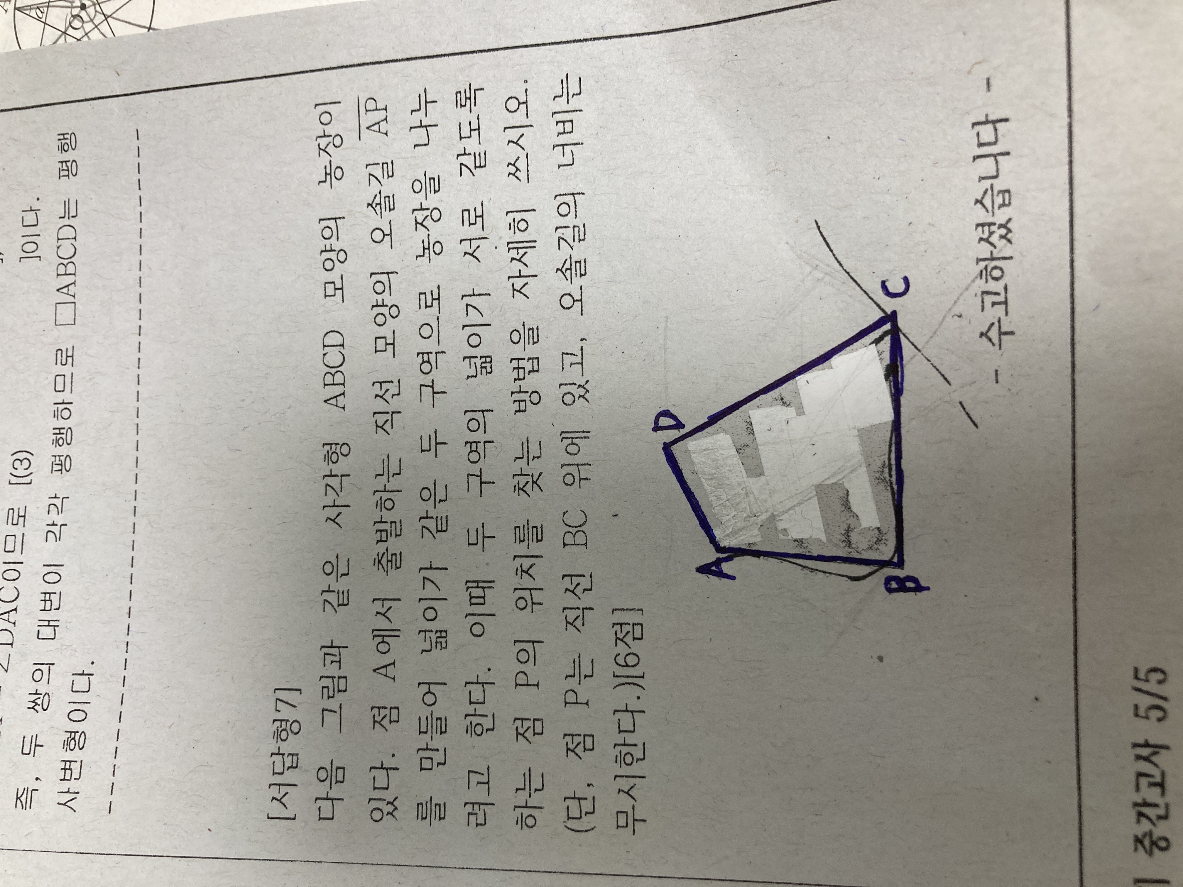 [기하]중2도형 사각형입니다 작성자COCO123|작성시간21.10.19|조회수210 목록 댓글 1 글자크기 작게가 글자크기 크게가 1. 제목에 출처와 범위를 써주세요2. 출처:3. 범위:4. 나는 이런 방식으로 풀었어요:학교 시험에서 나온 문제인데 조건상 가능한가 해서 여쭤봅니다 다음검색 현재 게시글 추가 기능 열기 북마크 공유하기 신고 센터로 신고 댓글 댓글 1 댓글쓰기 답글쓰기 댓글 리스트 작성자대각국사 | 작성시간 21.10.19 AC에 평행이고 D를 지나는 직선이 BC의 연장선과의 교점을 E라 하면 사각형ABCD=삼각형ABEP가 BE의 중점이면 이등분 됩니다. 댓글 전체보기