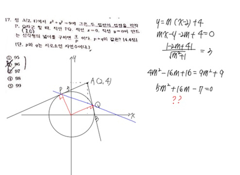 고등수학 원 접선의 방정식 문제 작성자바다조명|작성시간22.06.30|조회수846 목록 댓글 3 글자크기 작게가 글자크기 크게가 1. 제목에 출처와 범위를 써주세요2. 출처: 학교 기말고사3. 범위: 원의 방정식4. 나는 이런 방식으로 풀었어요:이렇게 푸는 게 아닌 것 같아요...어떻게 풀어야 할까요? ㅠㅠ 다음검색 현재 게시글 추가 기능 열기 북마크 공유하기 신고 센터로 신고 댓글 댓글 3 댓글쓰기 답글쓰기 댓글 리스트 작성자새-롬 | 작성시간 22.06.30 극선의 방정식을 이용하면 빠릅니다. (인터넷을 이용하시면.)2x+4y=9 가 P, Q를 지나는 극선의 방정식이므로 1/2 9/2 9/4 =81/16 =97 답댓글 작성자바다조명 작성자 본인 여부 작성자 | 작성시간 22.07.01 그 풀이를 고1 때 배우나요? ㅇ0ㅇ 답댓글 작성자순두부 | 작성시간 22.07.01 바다조명 두 접점을 지나는 직선의 방정식 구하는 문제는 많이 나옵니다공식화해서 외워두면 편하겠죠 댓글 전체보기