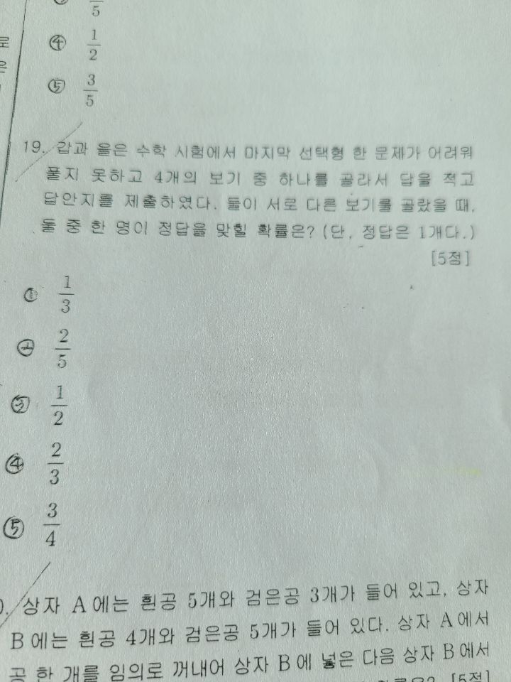 중2확률 기출문제 작성자짜짜리|작성시간22.12.14|조회수387 목록 댓글 4 글자크기 작게가 글자크기 크게가 답을 모르겠어요도움 부탁드립니다 다음검색 현재 게시글 추가 기능 열기 북마크 공유하기 신고 센터로 신고 댓글 댓글 4 댓글쓰기 답글쓰기 댓글 리스트 작성자새-롬 | 작성시간 22.12.14 2x1/4×3/3 = 1/2 아닐까합니다~~ 작성자m-teacher | 작성시간 22.12.14 그냥 2/4 = 1/2 답댓글 작성자m-teacher | 작성시간 22.12.14 두명이 찍은 번호 두개중 하나가 정답일확률만일 두명이 각각 1,2번을 찍었다면정답이 1번이나 2번일 확률 = 2/4 = 1/2 작성자짜짜리 작성자 본인 여부 작성자 | 작성시간 22.12.14 도움 감사합니다~! 댓글 전체보기
