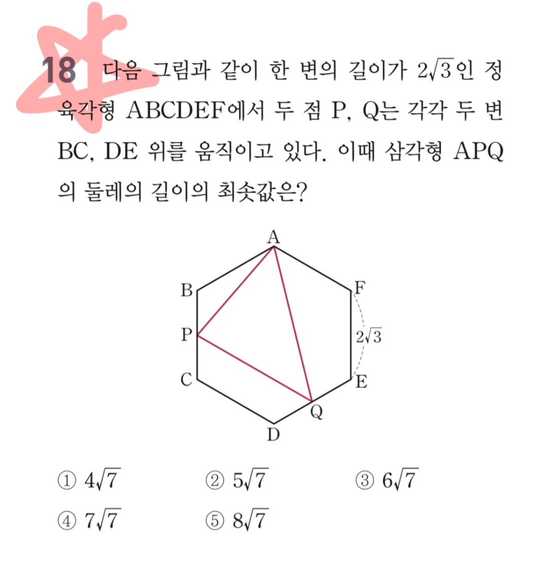 삼각함수활용 작성자쿨럭|작성시간23.06.25|조회수284 목록 댓글 2 글자크기 작게가 글자크기 크게가 이걸 대칭이동하고 너무 대칭시키고 기하적으로 푸는걸 봤었는데 사인법칙이나 코사인법칙같은걸로 다른풀이 없을까요? 다음검색 현재 게시글 추가 기능 열기 북마크 공유하기 신고 센터로 신고 댓글 댓글 2 댓글쓰기 답글쓰기 댓글 리스트 작성자한량 | 작성시간 23.06.25 세변이 모두 변수라서 더 힘들거같은데요 작성자오대감 | 작성시간 23.06.25 0 ≤ p ≤ 2√30 ≤ q ≤ 2√3인 범위에서 다음 식의 최소값을 구하면 됩니다. 이미지 확대 댓글 전체보기
