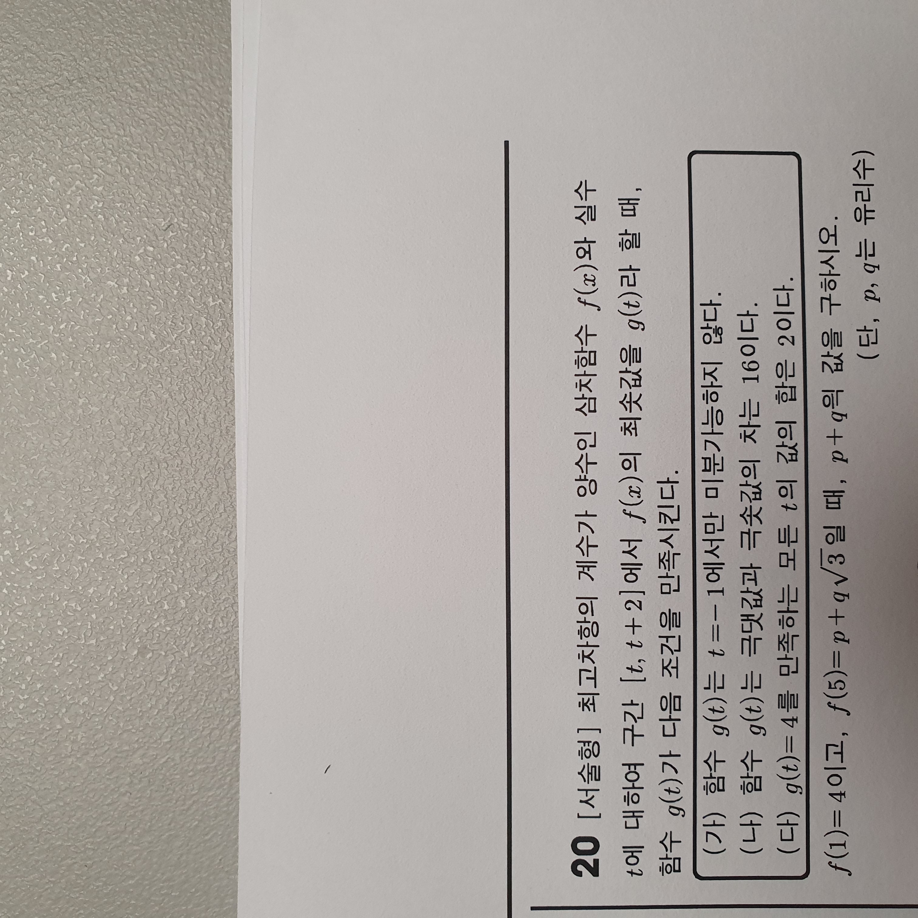 2. 그 점에서 함숫값이 4이면 다 조건이 성립할 것 같다.. 그러면 함수는 f(x)-4=a(x+1)(x-1)(x-3) 이고, 나 조건 이용해서 a구하면 a=3sqrt(3) 이므로 p=4,q=144