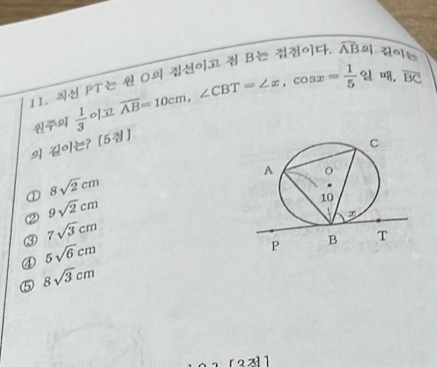 중 3-2 원주각의 활용 어떻게 풀까요? 작성자sfrae|작성시간23.11.24|조회수251 목록 댓글 2 글자크기 작게가 글자크기 크게가 1. 제목에 출처와 범위를 써주세요2. 출처:3. 범위:4. 나는 이런 방식으로 풀었어요:풀이 아시는 분 부탁드려봅니다. ㅠㅠ 다음검색 현재 게시글 추가 기능 열기 북마크 공유하기 신고 센터로 신고 댓글 댓글 2 댓글쓰기 답글쓰기 댓글 리스트 작성자홍재 | 작성시간 23.11.24 중심O에서 현AB에 수선발H 그으면HB=5각ACB=각ABP=60도 니까 걱ABO=30도 원의반지름OB=10루트3/3O에서 현BC에 수선의발K내리면각BOK=x도 이므로 OK길이는 반지름의5분의1배 피타고라스로 KB구하고 2배하면 답 답댓글 작성자sfrae 작성자 본인 여부 작성자 | 작성시간 23.11.24 풀이 감사합니다. 예 이해됐습니다 감사합니다! 댓글 전체보기