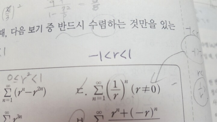 ㄷ에서 r은 0이 아니라 했으므로 0<ㅣrㅣ<1. 역수를 취하면 ㅣ1/rㅣ>1. 따라서 1/r은 1초과 또는 -1미만.