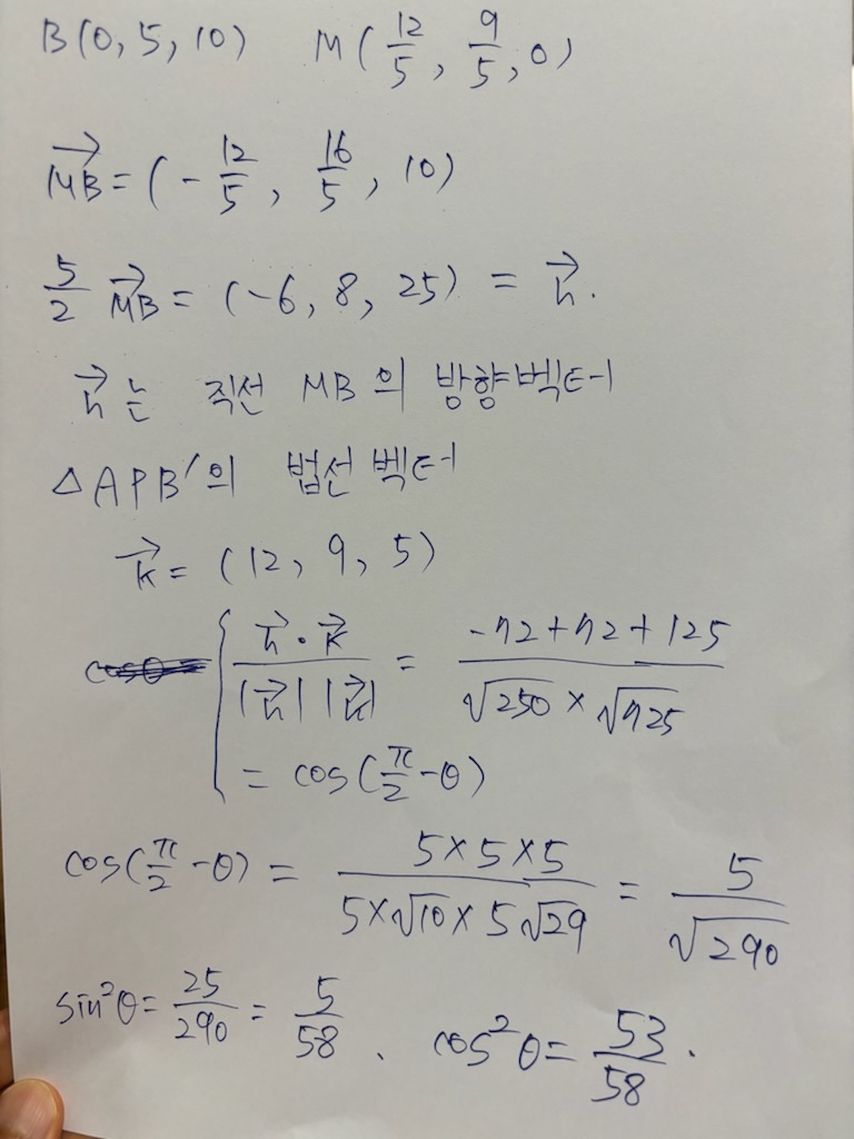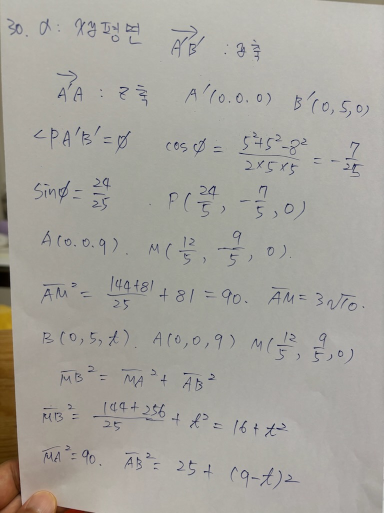 7월 모의고사 교육청 기하 28번 과 기하30번 풀이가 제시된 것과 달라서 풀이를 올려봅니다. 기하 28번 문제는 중학교 2학년 닮음 과정을 찾아야 쉽게 풀리는 문제 같습니다. 만약에 A 의 x좌표가 0 이 아닌 a에 관한 다른 값을 제시했다면 다른 방법으로 풀이를 해야 할 것 같습니다. 만약 제가 출제자 였다면 A좌표가 y축에 있지 않다고 했을 것입니다. 기하 30번 문제는 공간좌표계와 평면의 방정식으로 풀리는 문제라서 평가원 모의고사 나 수능문제에서 출제 되었다면 논란이 될 수도 있었을 것 같아요. 교육청에서 제시된 풀이방법과 제가 풀이한 방법과 다른 풀이가 있으면 알려주시기 바랍니다.