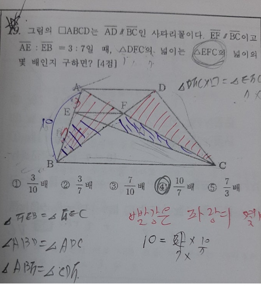 중2 풀이가 맞나요 작성자하면된다|작성시간24.08.24|조회수227 목록 댓글 2 글자크기 작게가 글자크기 크게가 마무리 정리가 잘 안되네요. 다음검색 현재 게시글 추가 기능 열기 북마크 공유하기 신고 센터로 신고 댓글 댓글 2 댓글쓰기 답글쓰기 댓글 리스트 작성자주먹99 | 작성시간 24.08.24 직선 EF와 DC의 교점을 G라고 했을 때, 선분 EF= 선분 FG 이기에 (평행선 사이 길이의 비)두 삼각형의 밑변을 각각 EF와 FG로 보고, 높이의 비만 비교하면 될 것 같습니다. 답댓글 작성자하면된다 작성자 본인 여부 작성자 | 작성시간 24.08.28 감사합니다 댓글 전체보기