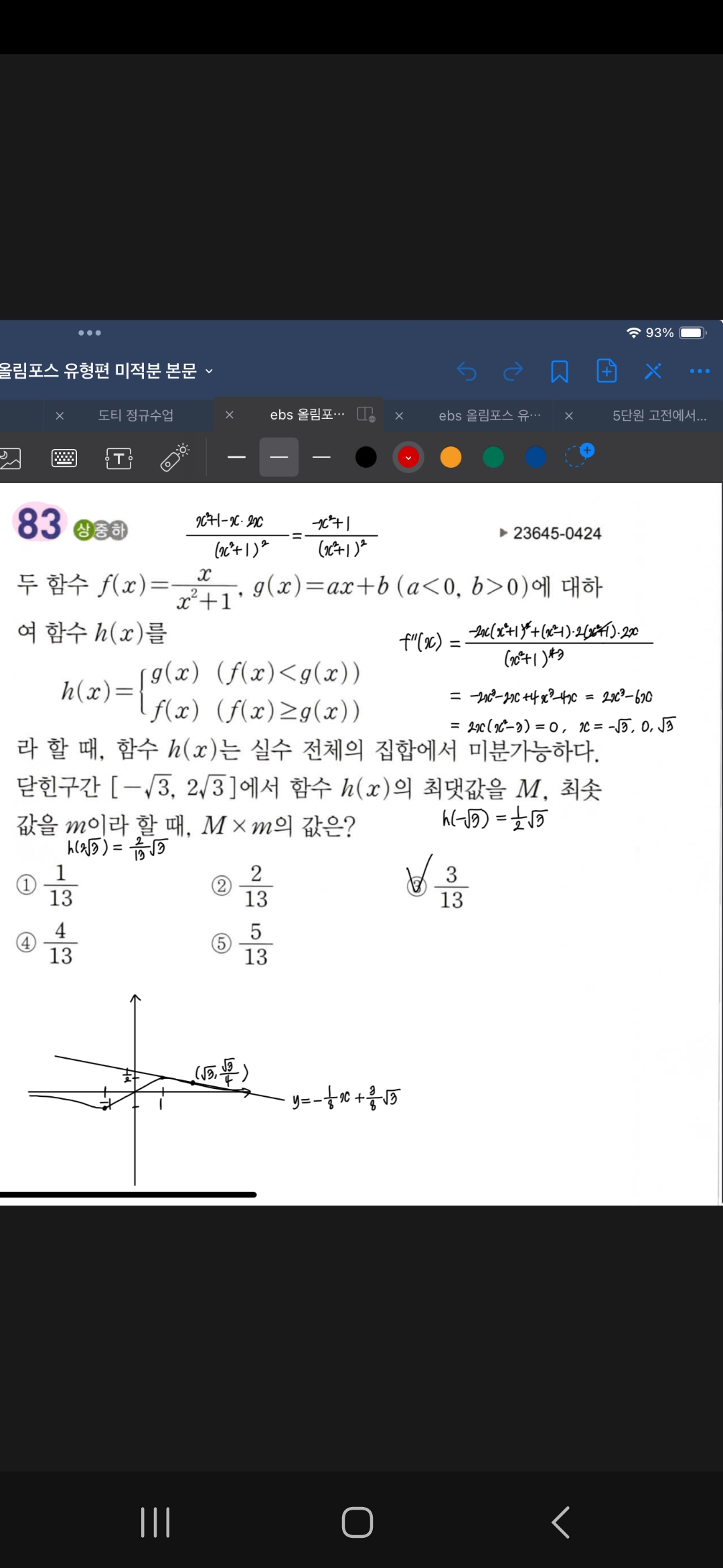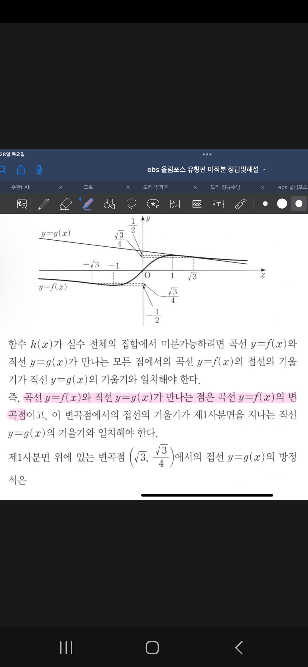[미적분]변곡점과 접선 작성자탐구자|작성시간24.11.28|조회수64 목록 댓글 2 글자크기 작게가 글자크기 크게가 f(x)와 g(x)가 왜 변곡점에서 접하는지가선뜻 이해가 안가네요.....해설그림에서 접점인 변곡점이 가장 볼록하게 그려져 있는데 그점도 이해가 안됩니다,고수님의 도움을 부탁드립니다~ㅠ 다음검색 현재 게시글 추가 기능 열기 북마크 공유하기 신고 센터로 신고 댓글 댓글 2 댓글쓰기 답글쓰기 댓글 리스트 작성자스티븐 10R | 작성시간 24.11.28 접하지 않으면 교점을 기준으로 함수가 달라지는데, 그러면 좌우 미분계수가 다르게 되고, 그러면 미분 불가능하게되죠. 따라서 반드시 접해야만 합니다. 답댓글 작성자탐구자 작성자 본인 여부 작성자 | 작성시간 24.11.28 대단히 감사합니다~~^^ 댓글 전체보기