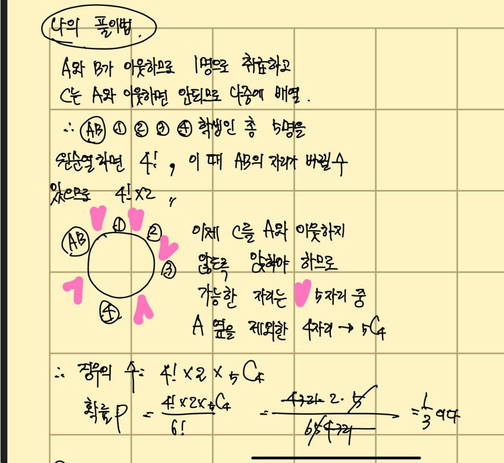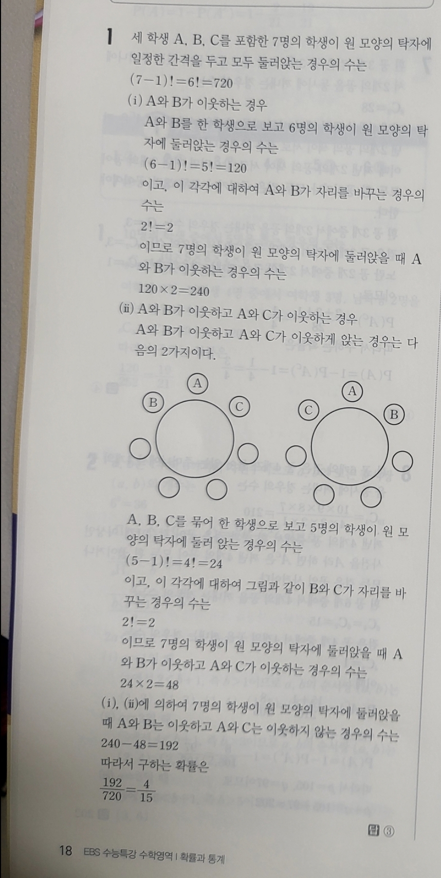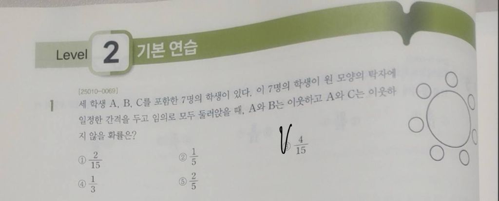 2026 수능특강 확률과통계 문제 작성자땡여사|작성시간25.02.08|조회수422 목록 댓글 3 글자크기 작게가 글자크기 크게가 2026 수능특강 확률과 통계 38쪽 1번 문항입니다.문제와 답지 함께 올립니다. 답지 방식은 이해했습니다.왜 저의 풀이법대로 문제를 풀면 틀리는지 그 이유가 궁금합니다. 다음검색 현재 게시글 추가 기능 열기 북마크 공유하기 신고 센터로 신고 댓글 댓글 3 댓글쓰기 답글쓰기 댓글 리스트 작성자대각국사 | 작성시간 25.02.08 5C4가 아니라 4입니다 답댓글 작성자땡여사 작성자 본인 여부 작성자 | 작성시간 25.02.08 맞네요 ^^:;;;; 감사합니다 작성자오대감 | 작성시간 25.02.08 그냥2/6 × 4/5 = 4/15로 구하는게 편할 듯 하네요. 댓글 전체보기