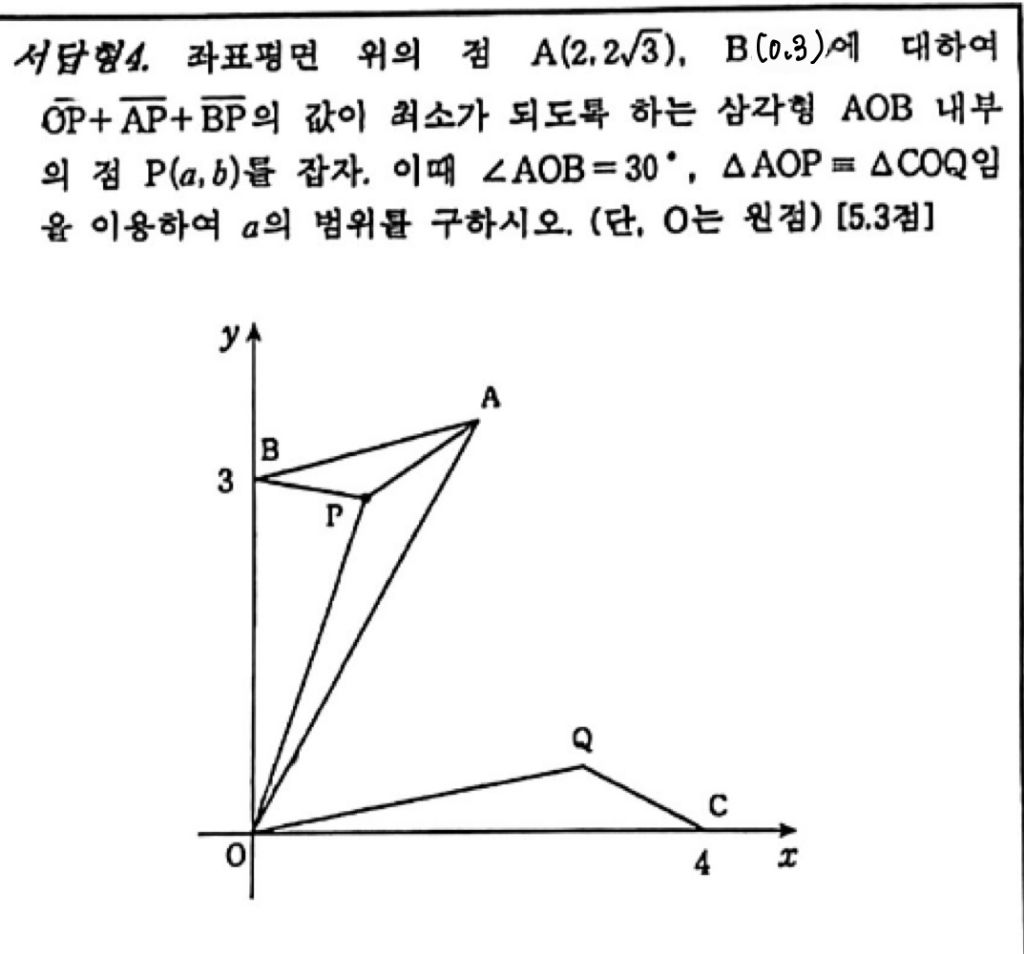 고1 공통수학2 기출 작성자새우깡|작성시간25.09.30|조회수112 목록 댓글 1 글자크기 작게가 글자크기 크게가 풀이 부탁합니다 다음검색 현재 게시글 추가 기능 열기 북마크 공유하기 신고 센터로 신고 댓글 댓글 1 댓글쓰기 답글쓰기 댓글 리스트 작성자JNP math | 작성시간 25.10.01 OP=OQAP=CQ이고 삼각형 OPQ는 정삼각형이 됩니다.따라서 OP=PQ가 됩니다.OP+AP+BP = PQ+CQ+BP가 되므로 최소길이는 BC의 길이 5가 됩니다.a 값의 범위를 구하는 문제이므로 직선 OP와 직선 BC의 교점의 x 좌표를 구하면 0<a< 12 / (3 + 4root3 ) 이 됩니다. 댓글 전체보기