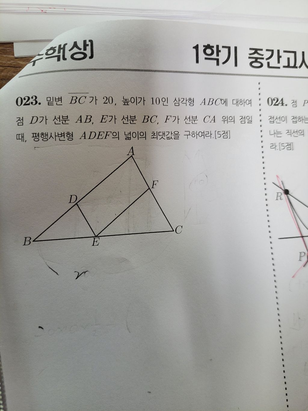 고1 1학기 중간 기출입니다 도움부탁드립니다 작성자도라에몽 진구|작성시간26.03.20|조회수60 목록 댓글 14 글자크기 작게가 글자크기 크게가 풀이 부탁드려요 23번은 답이 5024번은 마이너스 19 인데 풀이가 안됩니다부탁드려요 다음검색 현재 게시글 추가 기능 열기 북마크 공유하기 신고 센터로 신고 댓글 댓글 14 댓글쓰기 답글쓰기 댓글 리스트 해당 댓글은 작성자와 운영진만 볼 수 있습니다. 작성자불곰 | 작성시간 26.03.20 new 이미지 확대 해당 댓글은 작성자와 운영진만 볼 수 있습니다. 작성자불곰 | 작성시간 26.03.20 new X^2-mx-m+1=0을 완전제곱식으로 바꾸면 x=m/2 이것이 접점의 x죄표입니다. 답댓글 작성자도라에몽 진구 작성자 본인 여부 작성자 | 작성시간 26.03.20 new 이해했습니다 바쁘신데 감사합니다 ^^ 댓글 전체보기