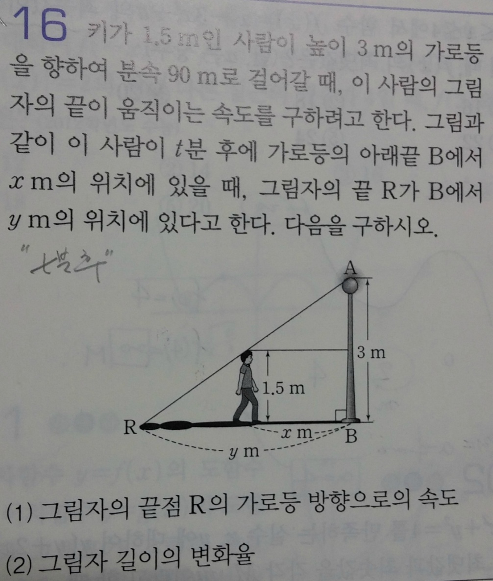 작성자펠프스되자 작성자 본인 여부 작성자 작성시간 16.02.15 제가 다시 헷갈리기 시작하네요...ㅎㅎ (1)에서 y의 길이의 변화율은 -180이 맞는데요..r점의 가로등방향으로의 속도는 정방향이니까 180인 거죠...근데 그 둘의 정확한 차이가 뭔가요? 길이의 변화율과 가로등방향의 속도...