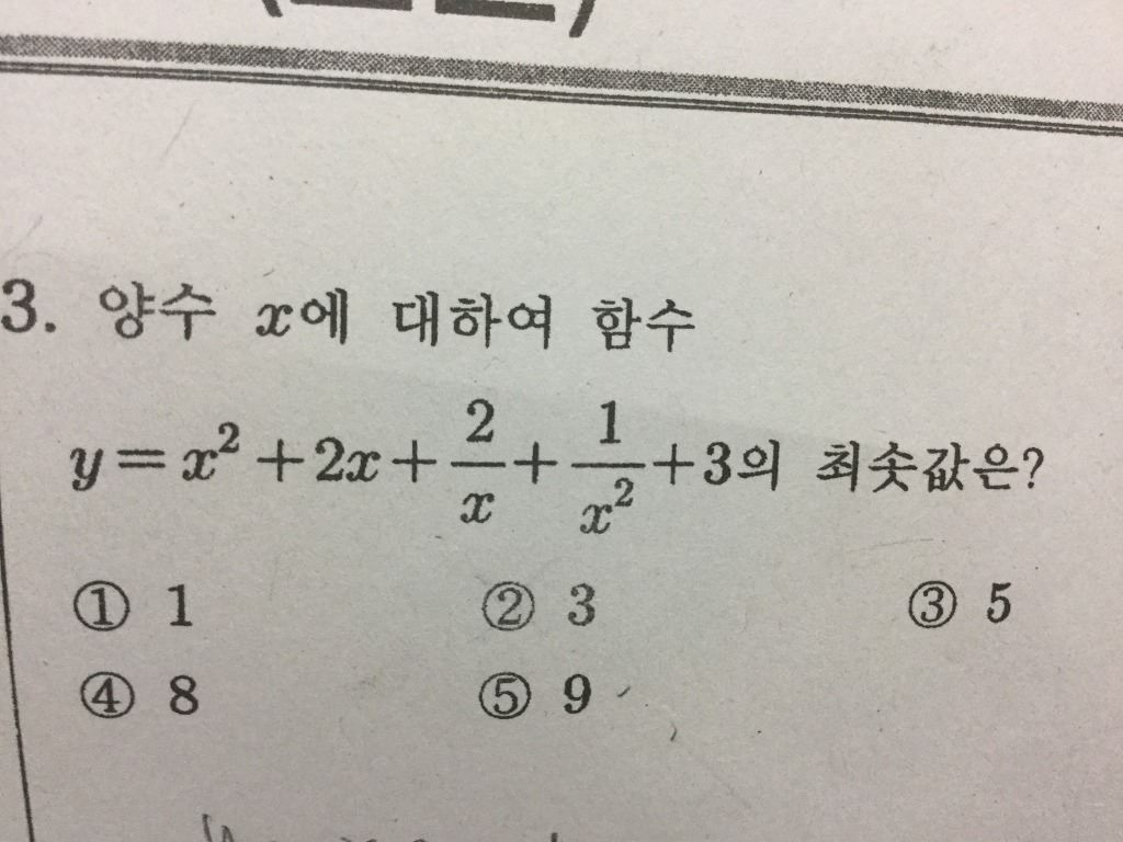 [고1]고1 이차함수 최대최소문제 작성자열공파|작성시간17.04.17|조회수870 목록 댓글 3 글자크기 작게가 글자크기 크게가 x + 1/x을 K로 치환하여 진행하면 막혀요풀이과정 좀 부탁드립니다 ㅠㅠ 다음검색 현재 게시글 추가 기능 열기 북마크 공유하기 신고 센터로 신고 댓글 댓글 3 댓글쓰기 답글쓰기 댓글 리스트 작성자동네노는형 | 작성시간 17.04.17 정답 9나옵니다 작성자동네노는형 | 작성시간 17.04.17 풀이 이미지 확대 작성자성지훈 | 작성시간 17.04.17 아마도 치환한 변수K의 범위를 설정안하신듯 하네요. 산술평균과 기하평균의 관계에서 K는 2 이상입니다.치환한 K에 대한 이차식에서 이차계수가 양수이니 아래로 볼록하고 축이 K=-1이니 K가 2이상인 범위에서 최솟값은 K=2일때의 값입니다. 댓글 전체보기