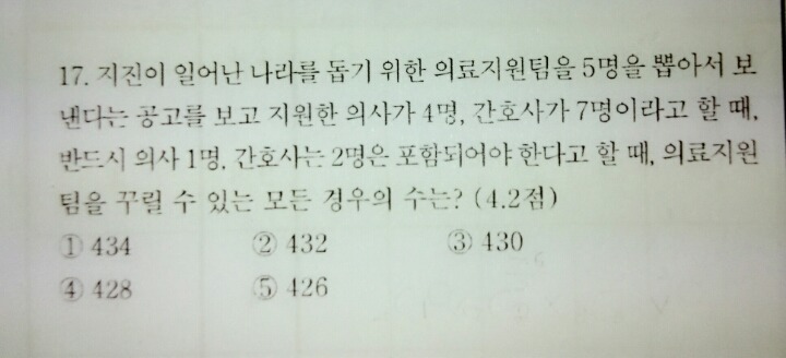 [고2][확통]조합-세종고 2016 쉬운문제인데 하나만 봐주세요 작성자마이클엔비|작성시간17.04.25|조회수108 목록 댓글 2 글자크기 작게가 글자크기 크게가 4c1 × 7c2 x 8c2 = 2352 아닌가요? 뭐가 잘못됬는지 ㅎㅎ 다음검색 현재 게시글 추가 기능 열기 북마크 공유하기 신고 센터로 신고 댓글 댓글 2 댓글쓰기 답글쓰기 댓글 리스트 작성자구리구리 | 작성시간 17.04.25 그렇게 풀면 중복이 생깁니다.의사 1번이 앞에 뽑이고 의사 2번 3번이 뒤에 뽑이는 것과 의사 2번이 앞에 뽑이고 의사 1번과 3번이 뒤에 뽑이면 같은 경우가 되어 버립니다.(의사, 간호사)=(1,4), (2,3), (3,2) 이렇게 나누어서 풀이 하시면 됩니다 답댓글 작성자마이클엔비 작성자 본인 여부 작성자 | 작성시간 17.04.25 아~그러네요 감사합니다^^ 댓글 전체보기