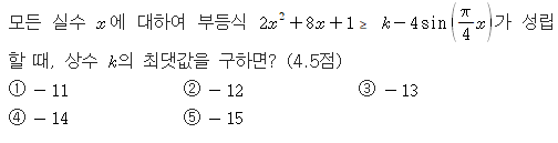 삼각부등식 질문입니다~ 작성자mathlove12|작성시간17.09.12|조회수52 목록 댓글 1 글자크기 작게가 글자크기 크게가 이항해서 판별식을 이용하면 될것 같은데 잘 풀리지 않아서요~선생님들의 답변 부타드리겠습니다~ 다음검색 현재 게시글 추가 기능 열기 북마크 공유하기 신고 센터로 신고 댓글 댓글 1 댓글쓰기 답글쓰기 댓글 리스트 작성자THE ONE | 작성시간 17.09.14 모든 방정식과 부등시을 그래프와의 교점 관계라고 생각하시는게 중요할겁니다.보통은 ķ를 남기고 나머지를 넘겨서 그리는게 맞는데 이경우누 싸인을 넘기면 더 이상할것같습니다.그래서 오히려 k를 넘겨서 이차함수를 오르락 내리락 꼭짓점 높이를 조절하시지요.-4sin값은 -4에서 +4까지 가지니깐 꼭짓점의 높이y좌표를 4보다 크거나 같다라고 하시면 됩니다 댓글 전체보기