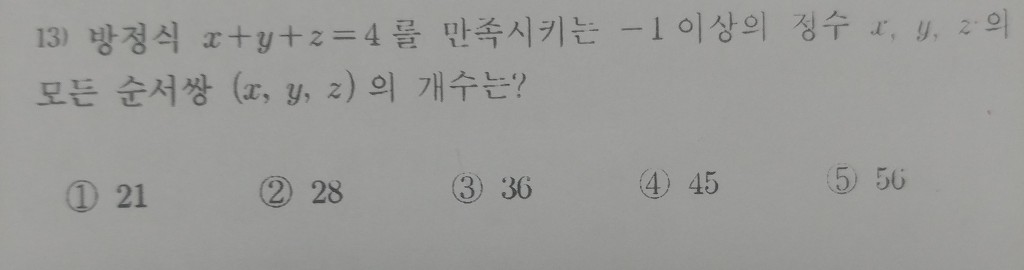 중복조합문제예요~ 작성자씬나는수학|작성시간17.09.15|조회수115 목록 댓글 1 글자크기 작게가 글자크기 크게가 변형이 되어서 못풀겠네요ㅠㅠ 다음검색 현재 게시글 추가 기능 열기 북마크 공유하기 신고 센터로 신고 댓글 댓글 1 댓글쓰기 답글쓰기 댓글 리스트 작성자카니 | 작성시간 17.09.15 -1이상이므로 오히려 1씩더해서 0이상의 정수로 해석하시면 3H7=9C7=36 댓글 전체보기