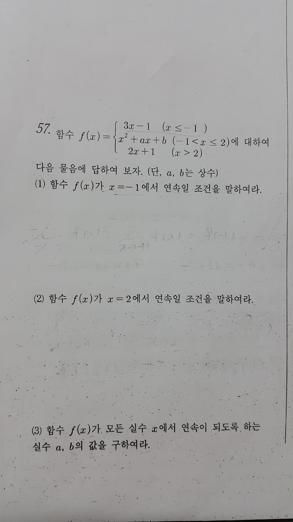 [수학]함수의극한과연속 문제입니다..잘 안풀리네요.ㅠ 작성자미서미서미소야|작성시간16.04.12|조회수359 목록 댓글 2 글자크기 작게가 글자크기 크게가 좌극한 =우극한=함수값이렇게 푸는거 아닌가요? 제가푼것과 답이 전혀다르게 나와요..프린트오류인지..ㅠ 다음검색 현재 게시글 추가 기능 열기 북마크 공유하기 신고 센터로 신고 댓글 댓글 2 댓글쓰기 답글쓰기 댓글 리스트 작성자사미랑 | 작성시간 16.04.12 (1) x=-1 에서 연속 이려면 3x-1 에서 좌극한,함수값이 -4 , 우극한은 1-a+b 이므로 조건은: a-b= 5(2) x=2 에서 연속 이려면 좌극한,함수값이 4+2a+b ,우극한은 5 이므로 조건은 : 2a+b= 1(3) 위 조건을 연립하여 풀면 . a=2, b=-3 답댓글 작성자미서미서미소야 작성자 본인 여부 작성자 | 작성시간 16.04.12 감사합니다~연산이 안됐네요..ㅠ 댓글 전체보기