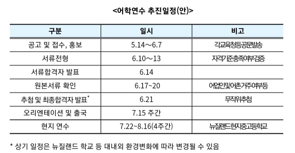 여름방학에 뉴질랜드로 떠날 어촌 청소년 모집- 한-뉴질랜드 자유무역협정(FTA) 연계 ‘어촌 청소년 현지 어학연수’ 작성자성재|작성시간24.05.14|조회수10 목록 댓글 0 글자크기 작게가 글자크기 크게가 http://www.newscontact24.co.kr/news/285341여름방학에 뉴질랜드로 떠날 어촌 청소년 모집 - 뉴스컨택24해양수산부(장관 강도형)는 「한-뉴질랜드 자유무역협정(FTA) 수산협력사업(이하 한-뉴 수산협력사업)」의 일환으로 추진되는 ‘2024년도 어촌 청소년 현지 어학연수*’의 참가자를 모집한다. * www.newscontact24.co.kr 다음검색 현재 게시글 추가 기능 열기 북마크 공유하기 신고 센터로 신고 댓글 댓글 0 댓글쓰기 댓글 리스트