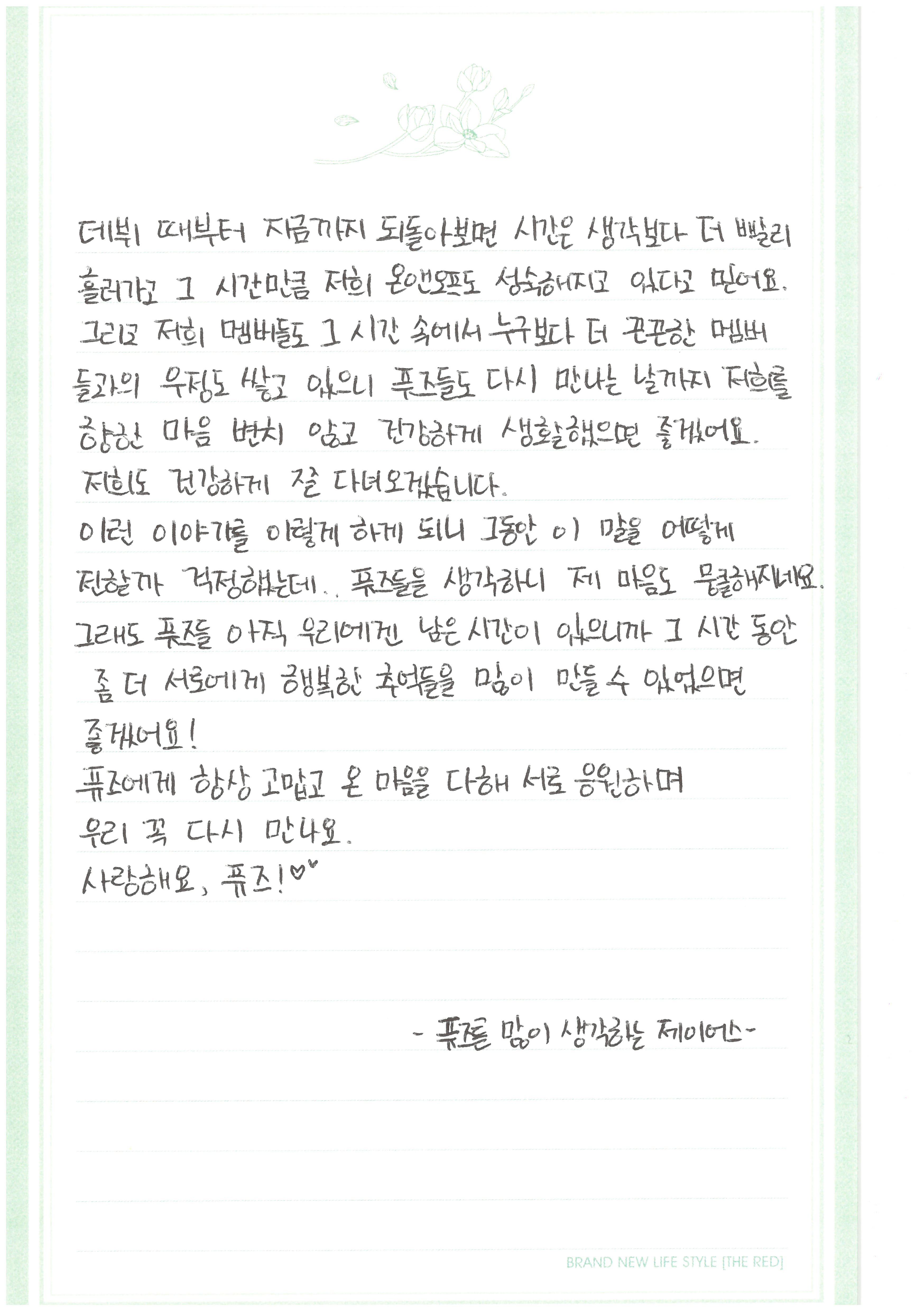 작성자졍졍주영 작성시간 23.06.15 열흘 남짓 남긴 지금..오빠의 편지를 또 보러 왔어요. 이걸 쓰면서 얼마나 착잡했을까.. 하면서도 이제 진짜 곧이라 설레기도 하네용 ㅎㅎ 곧 만나요💜