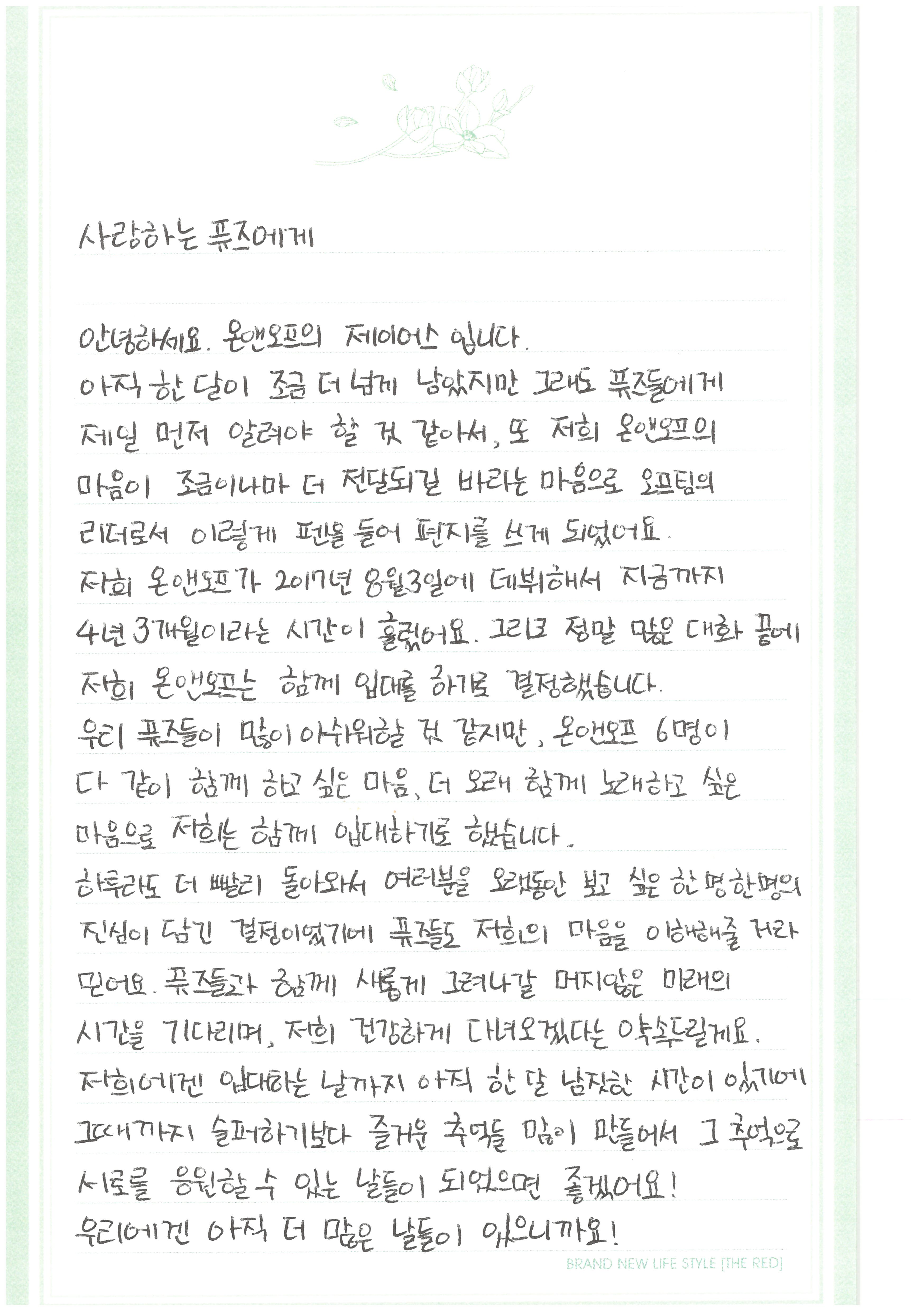 한달 남은 시간동안 아프지 말고 약속한대로 건강하게 제대해서 온앤오프 완전체로 다시만나요~ -