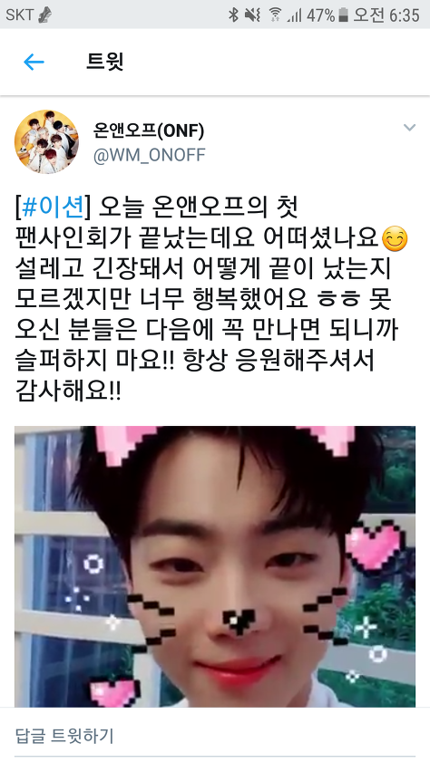 [트위터] 17.08.06 - 이션 작성자아톰|작성시간17.08.07|조회수379 목록 댓글 0 글자크기 작게가 글자크기 크게가 영상은 pic.twitter.com/BQcjrVMpzc출처 : 온앤오프 트위터 (@WM_ONOFF) 다음검색 현재 게시글 추가 기능 열기 북마크 공유하기 신고 센터로 신고 댓글 댓글 0 댓글쓰기 답글쓰기 댓글 리스트