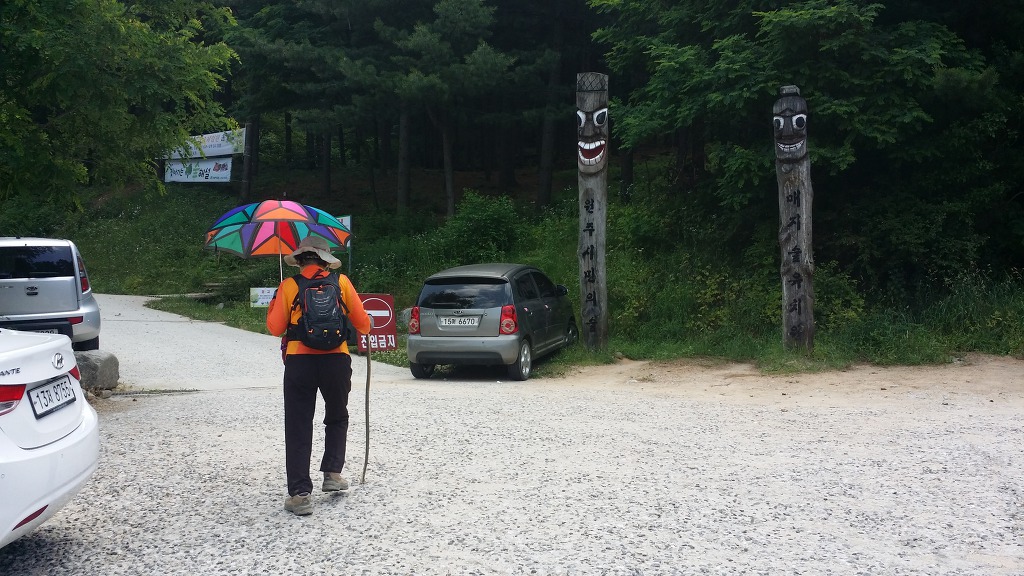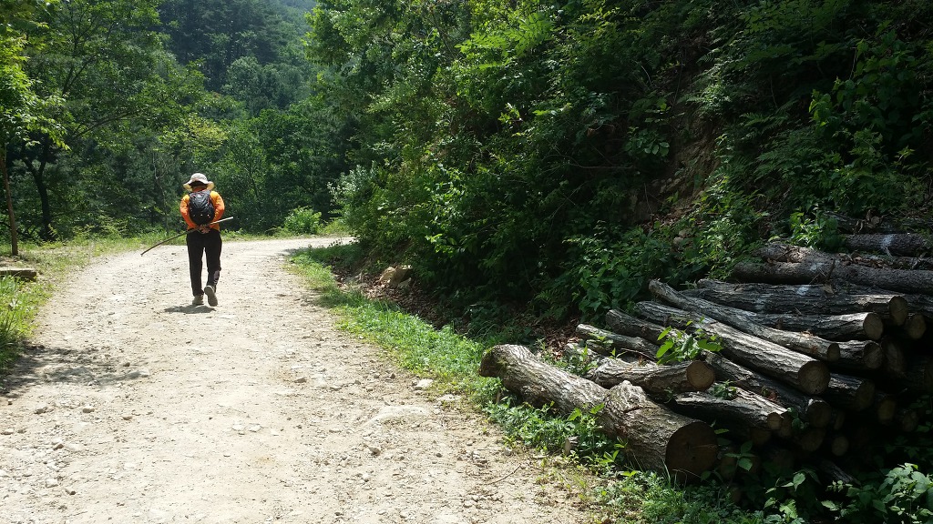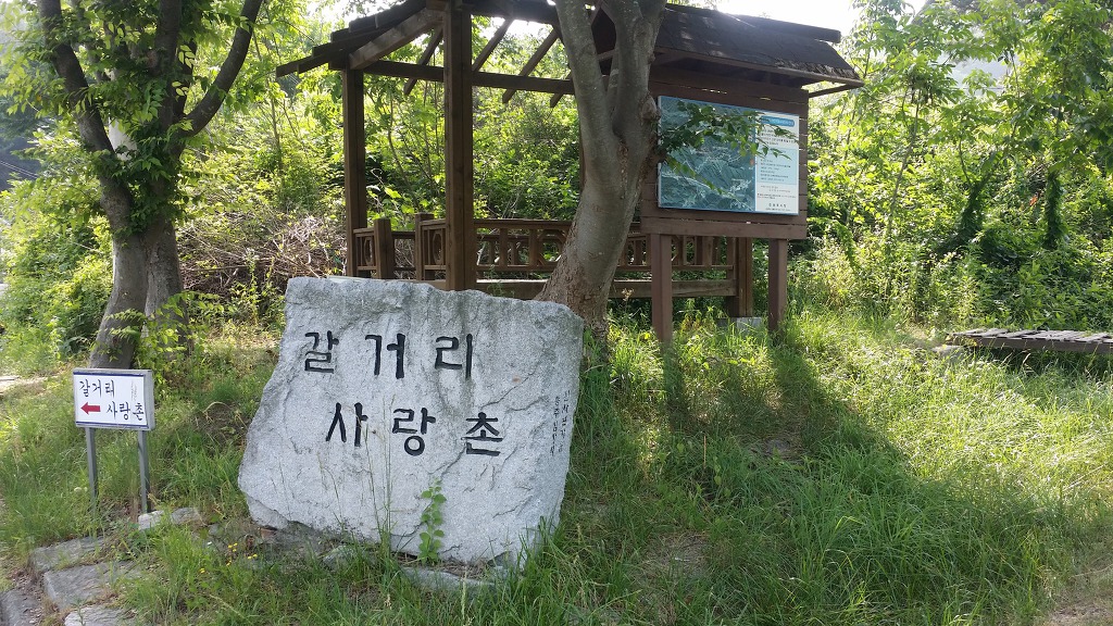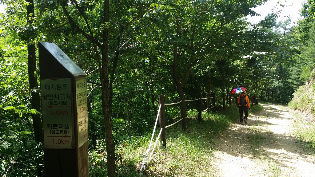 08:46 갈거리 사랑촌 표지석-민유임도 안내판. 임도 따라간다.