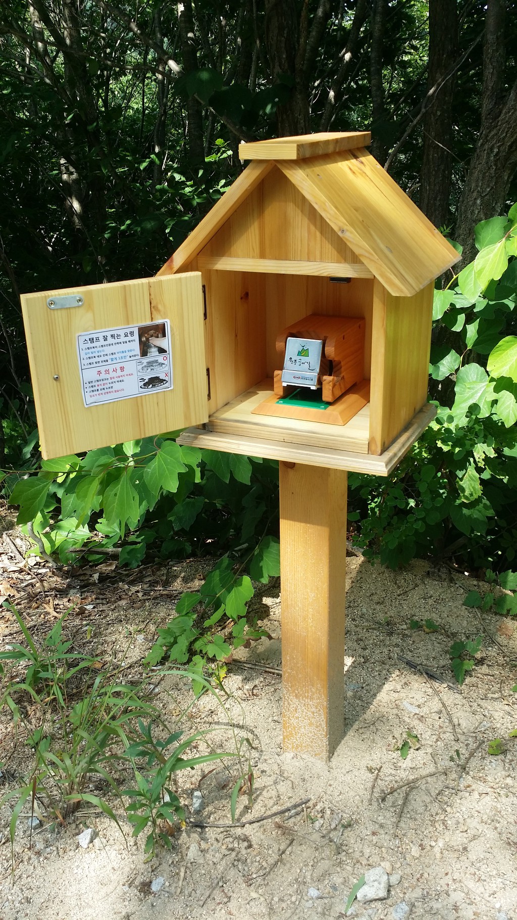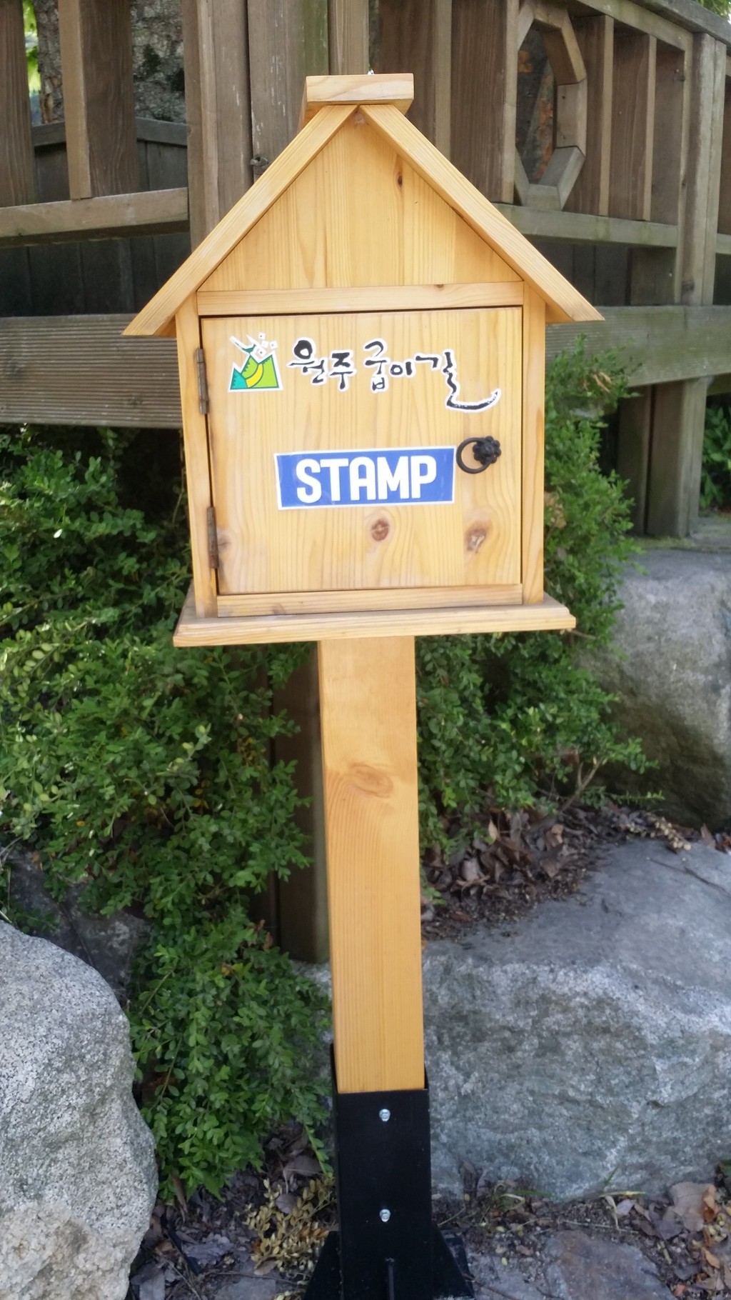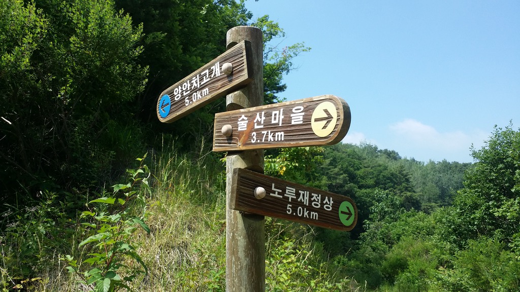 10:05 원주굽이길 스탬프 찍는 곳-이어 임도 갈림길. 이정표 (술산마을에서 3.7km지점. 양안치고개 5.0km/오른쪽 노루재 정상 5.0km)