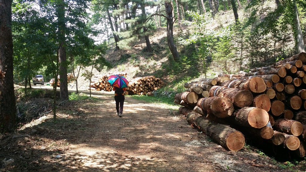 13:26 간벌해서 쌓아 놓은 나무-양안치 초입부터 계속 이어지고 있다.